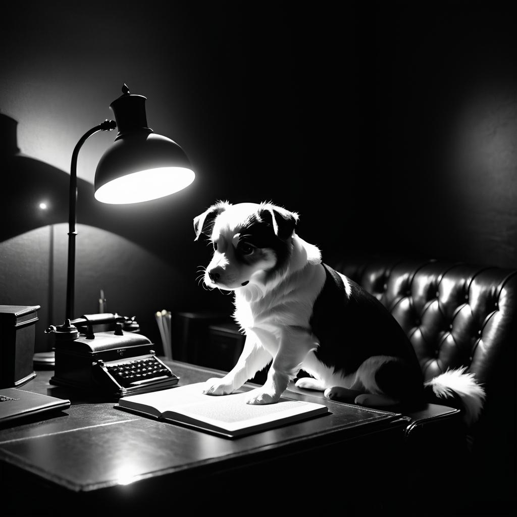 A dog writing a bestseller on a 90s smartphone, smoking in a dark noir room. Black and white, 1920s aesthetic, soft table lamp lighting, detailed film grain.