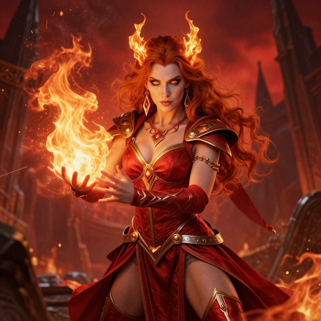 Digital artwork of a fiery, red-haired demoness with horns, wearing a red, gold-trimmed armor dress, conjuring flames in a fiery