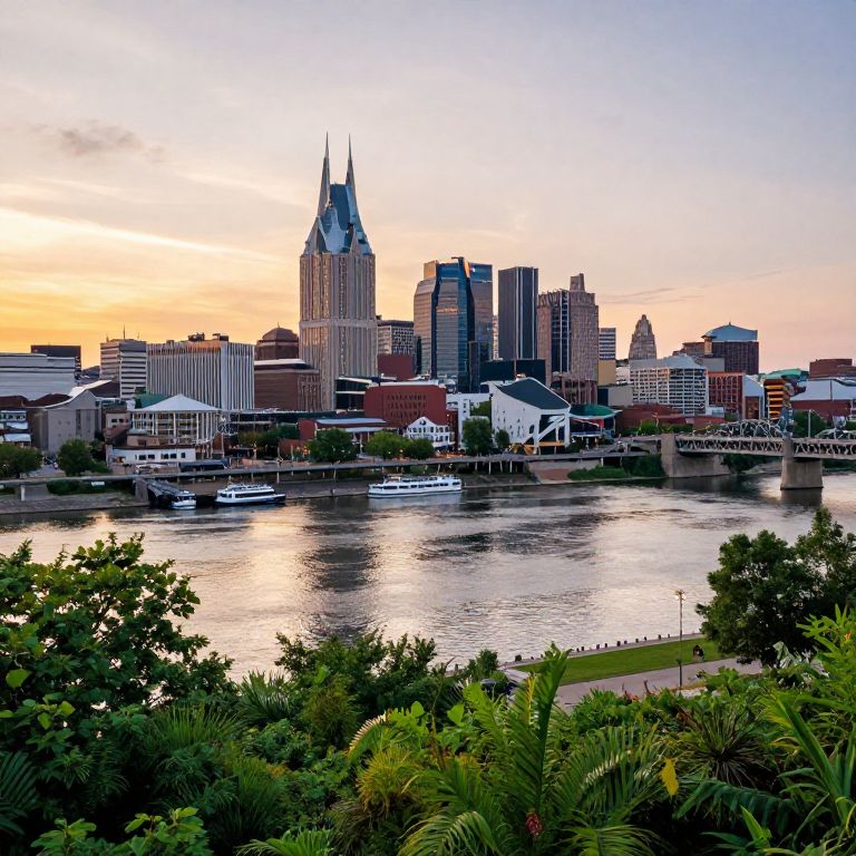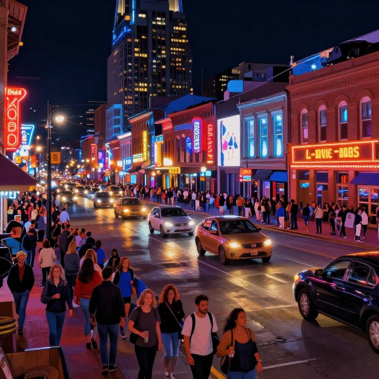 Nashville vibrant cityscape at sunset, showcasing iconic downtown skyline with glowing neon signs, lively streets filled with people and street performers, detailed urban textures, warm golden lighting, cinematic atmosphere, highly detailed, digital art