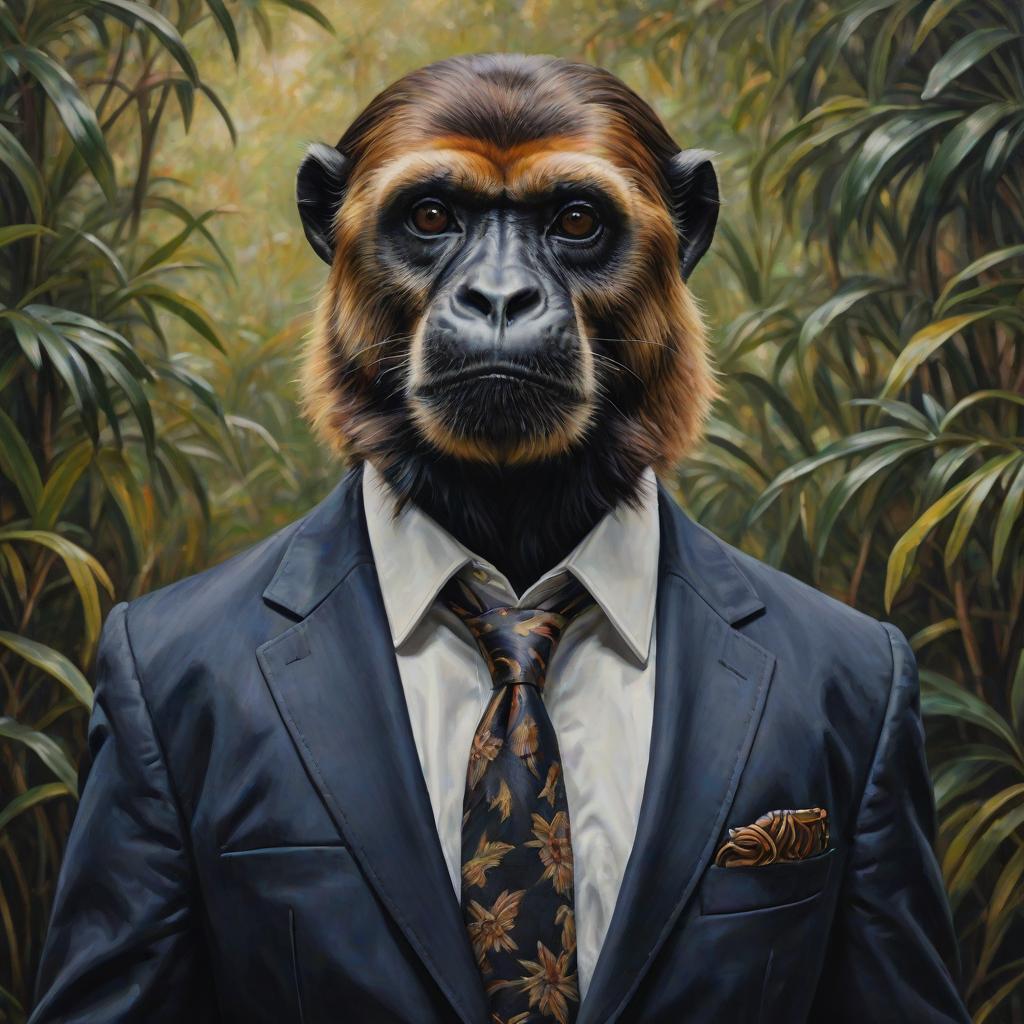 Realistic oil painting of a howler monkey wearing a beige blazer, white shirt, patterned tie, and dark vest. The monkey has detailed facial features with serious expression, set against a background of green tropical foliage. The image highlights a sophisticated, professional, and powerful presence with naturalistic colors and classic lighting.