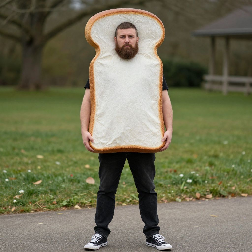 Photograph of a bearded man standing outdoors on a paved path in a grassy park. He is wearing black pants and black-and-white sneakers. He is creatively dressed with a large, toasted bread slice costume that encases his upper body, leaving his head and hands exposed. The bread slice has a golden-brown crust and white interior. The background includes blurred trees and a wooden gazebo. The image is humorous and surreal, blending everyday elements with a playful costume. The man's expression is neutral, and the overall scene is overcast.