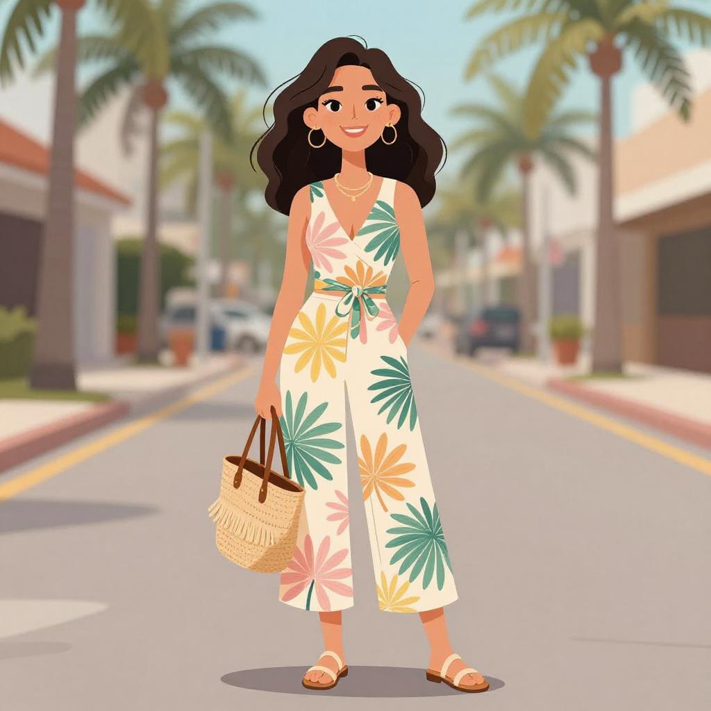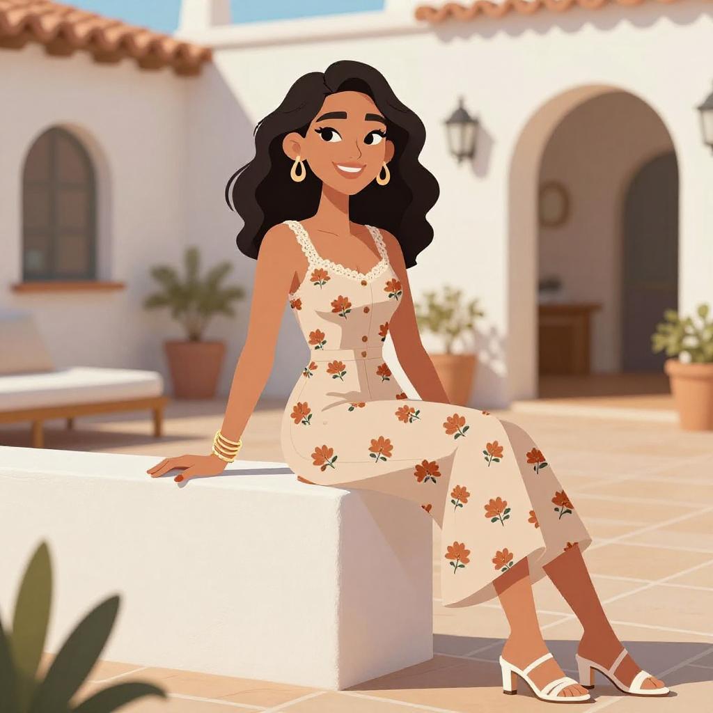 Woman with pretty face and pretty hair. smiling Woman, boho-chic, sleeveless jumpsuit in beige with small rust floral print, square neckline with lace trim, fitted waist with button-down front, wide-leg pants cropped mid-calf, thin strappy white heels, layered bracelets, drop earrings, lounging on a patio with Mediterranean-style architecture. --sref 1467