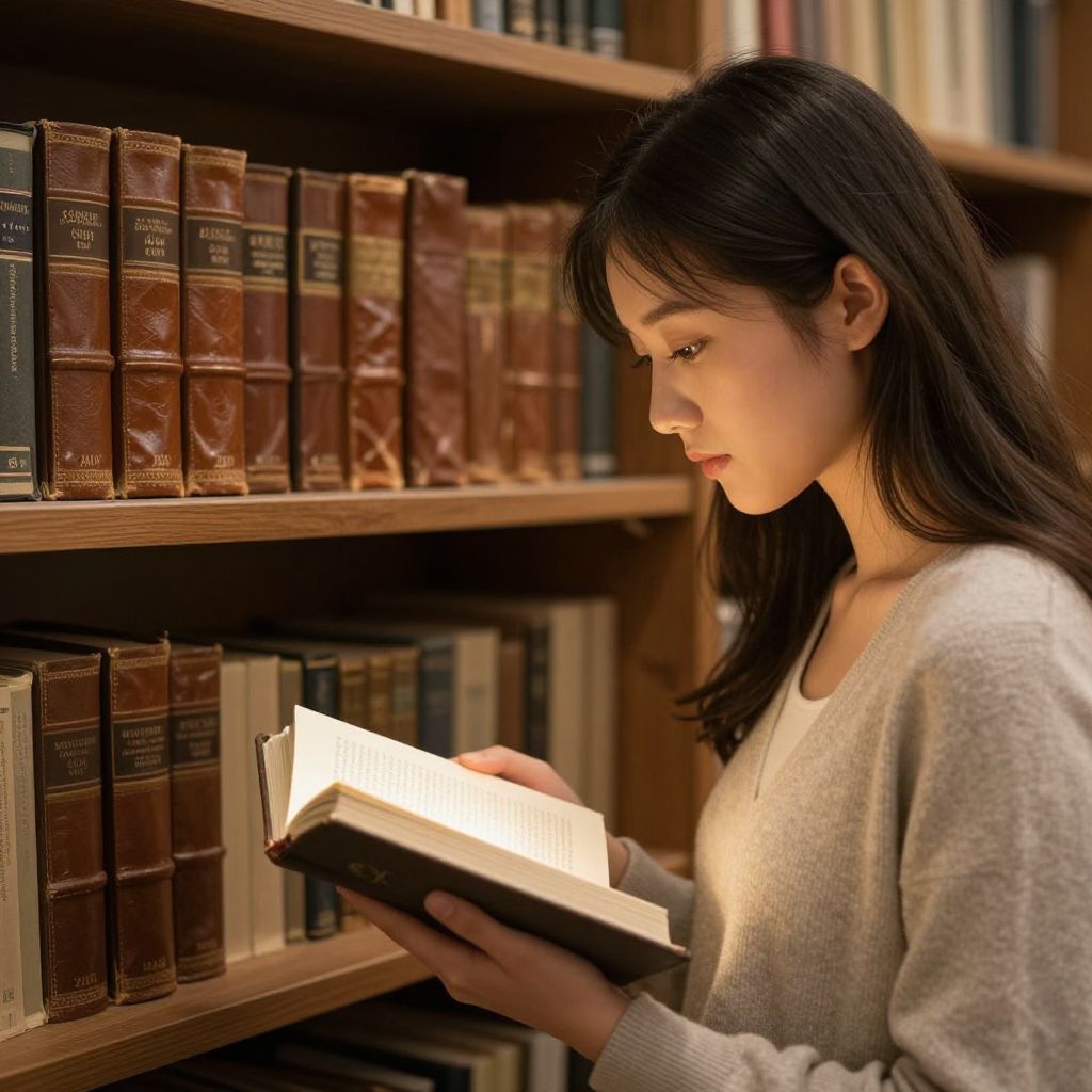 Photograph of an Asian woman with long black hair and fair skin, wearing a light gray knit sweater, standing in a library. She is focused on reading a book with a white bookmark, holding it in both hands. The background shows wooden shelves filled with leather-bound books, creating a warm, scholarly atmosphere. The lighting is soft, highlighting the woman's profile and the books' rich textures. The image captures a quiet, contemplative moment in a peaceful library setting.