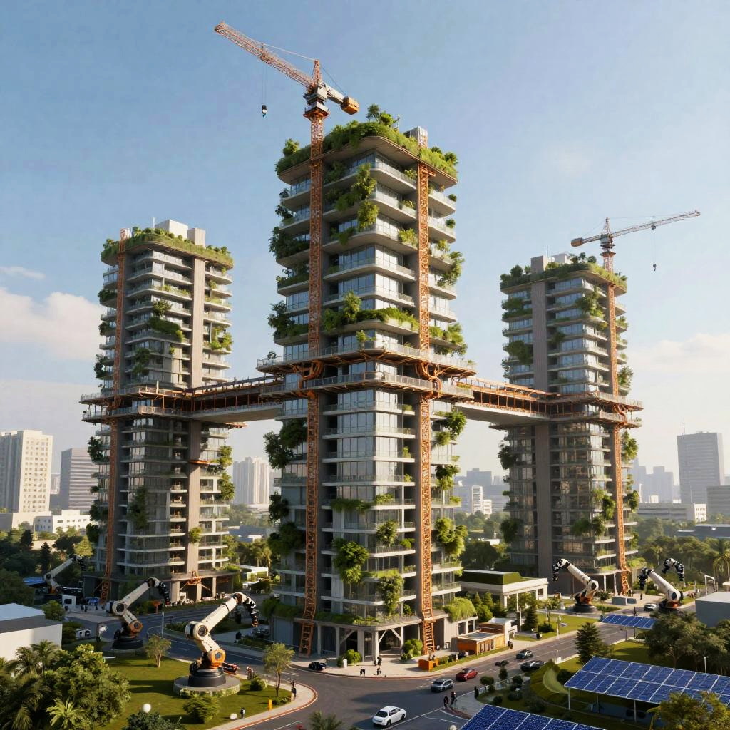 AI building generator producing an ultra-modern, sustainable cityscape featuring interconnected tower blocks with integrated greenery, automated construction robots building in harmony with nature, under a clear sky with soft sunlight and clean energy sources.