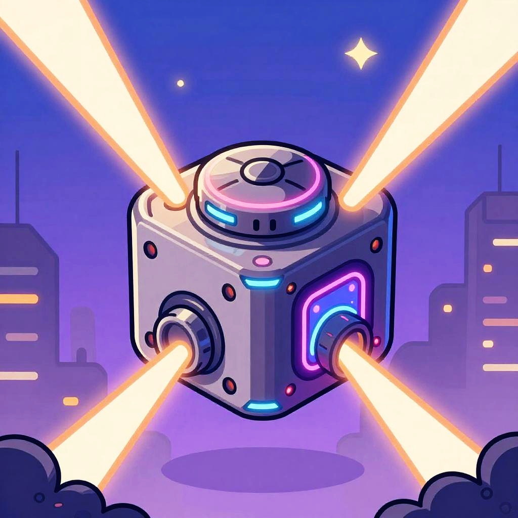 Generator cartoon featuring a futuristic energy generator floating in mid-air, sleek metallic design with neon highlights, surrounded by beams of glowing power, set against a sci-fi cityscape background, bold lines and vibrant hues.