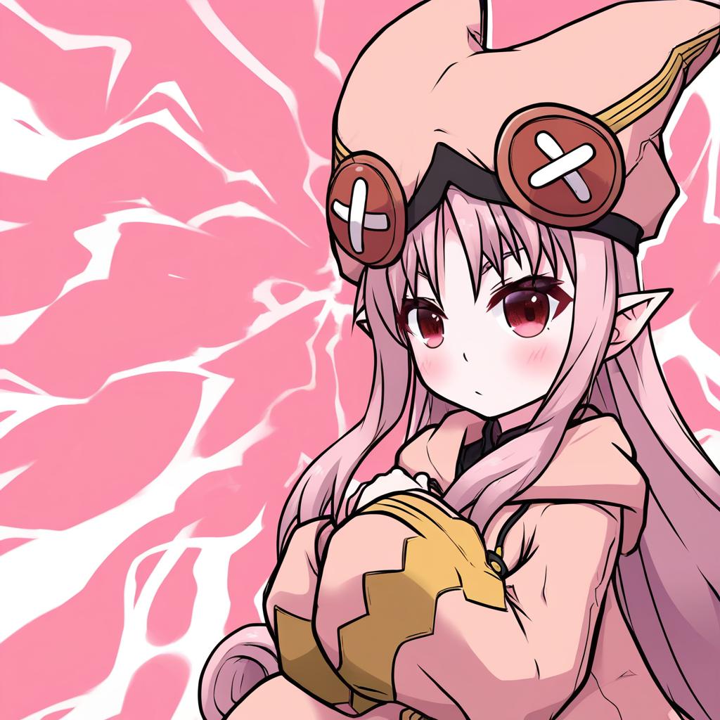 Habetrot (fate), fate (series), 1girl, pointy ears, red eyes, pink hair, long hair, sidelocks, hat, pink headwear, long sleeves, by artist k10k, leet