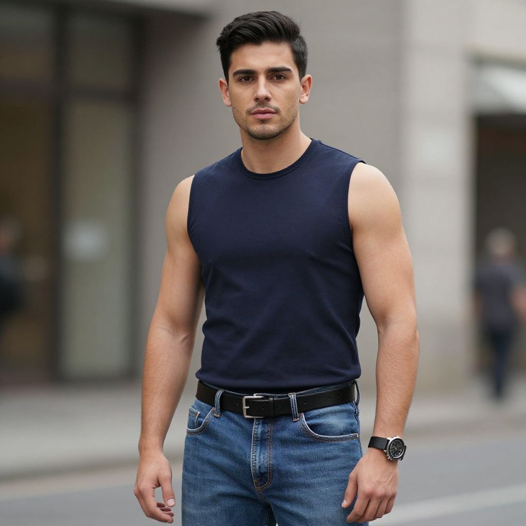 "stylish party wear dress, 1boy, male focus, solo, facial hair, sleeveless, black hair, black dress, dress, realistic, outdoors, blurry background, mustache, standing, blurry, feet out of frame, beard, sleeveless dress Realistic photo of casual sexy person with pretty face"