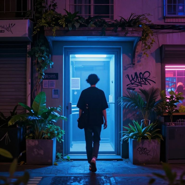 A futuristic, neon-lit street scene with a person walking towards a glowing door, surrounded by plants and graffiti.