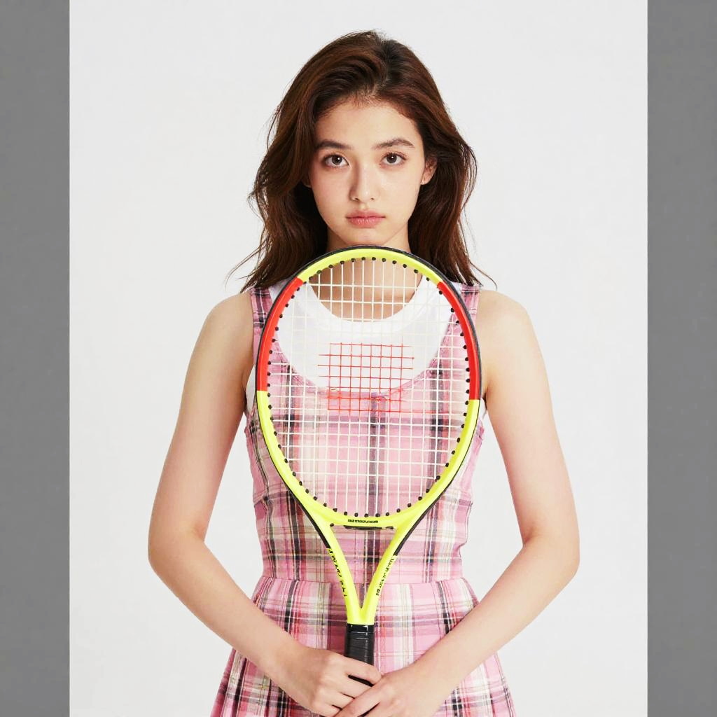 This photograph features a young Asian woman with fair skin and shoulder-length, wavy black hair. She is wearing a sleeveless, pink and white plaid dress with a fitted waist. She holds a yellow tennis racket with a red border in front of her chest, gripping the handle with both hands. Her expression is neutral, and she gazes directly at the camera. The background is a bright white, creating a stark contrast with the gray borders on either side of the image. The lighting is even, highlighting her face and the tennis racket.