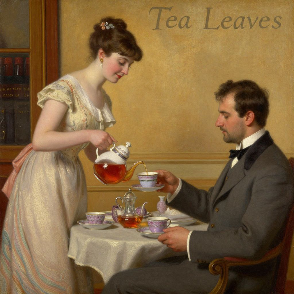 A vintage-style oil painting titled \"Tea Leaves\" by William McGregor Paxton depicts a formal tea service scene where a woman in a cream dress elegantly pours tea into a cup held by a man in a gray suit, set against a warm, golden-lit interior with soft, naturalistic lighting and detailed attention to texture and composition.