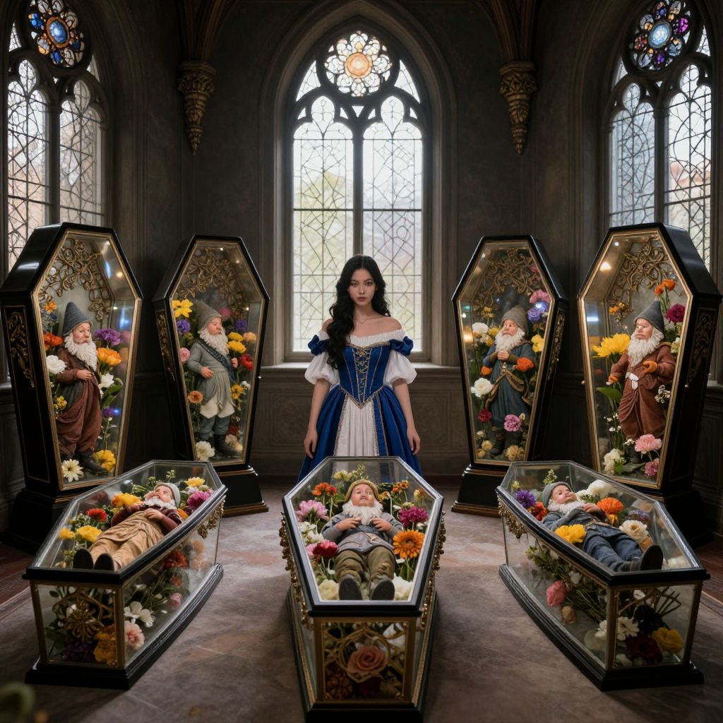 In this captivating image, a young woman with long, dark hair stands gracefully in a dimly lit room adorned with intricate, gothic-style windows. She is dressed in an elegant, off-the-shoulder dress with a blue bodice and white sleeves, exuding a sense of regality and mystery. The room is filled with six glass coffins, each meticulously crafted with ornate details and positioned in a symmetrical arrangement. Inside the coffins, six dwarfs are encased, their forms perfectly preserved and surrounded by lush, vibrant flowers that add a touch of life to the otherwise somber setting. The light filtering through the windows casts a soft, ethereal glow on the scene, highlighting the intricate patterns on the glass and the delicate textures of the flowers. The overall composition is balanced and harmonious, with the woman and the coffins creating a focal point that draws the viewer's eye through the room. The interplay of light and shadow, combined with the rich colors and detailed textures, creates a sense of depth and dimension, making the image both visually striking and emotionally evocative.