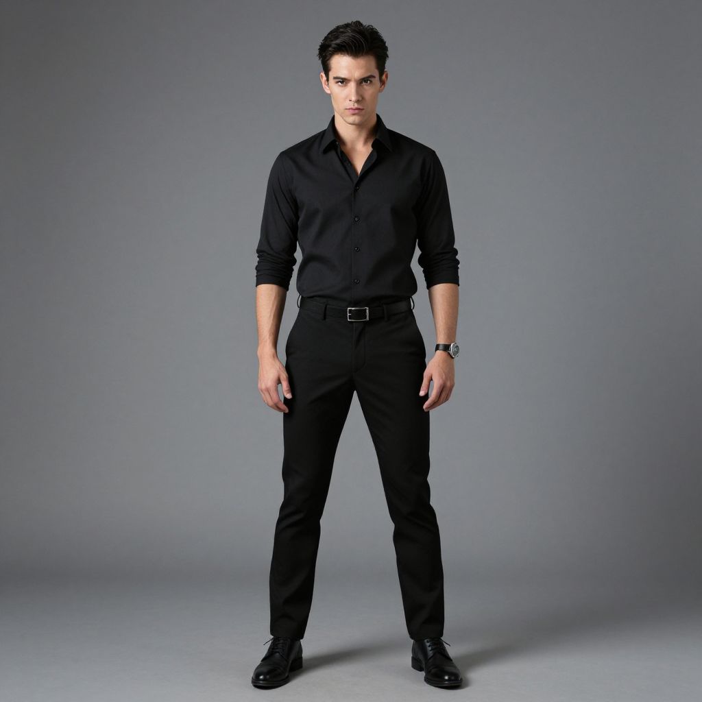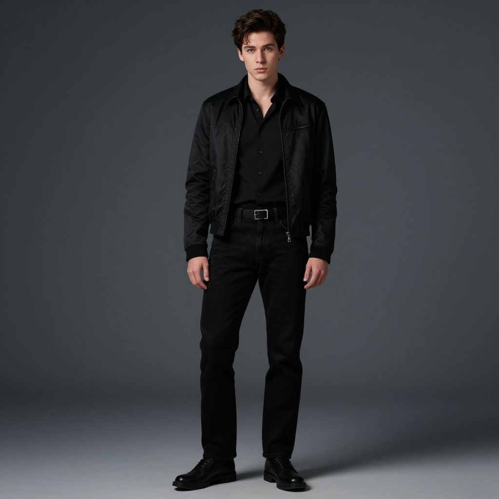 "black straight jeans costume, 1boy, male focus, solo, jacket, pants, denim, belt, realistic, brown hair, full body, jeans, shirt, standing, black shirt, shoes, open jacket, looking at viewer, black jacket, open clothes, leather jacket, closed mouth Realistic photo of casual sexy person with pretty face"