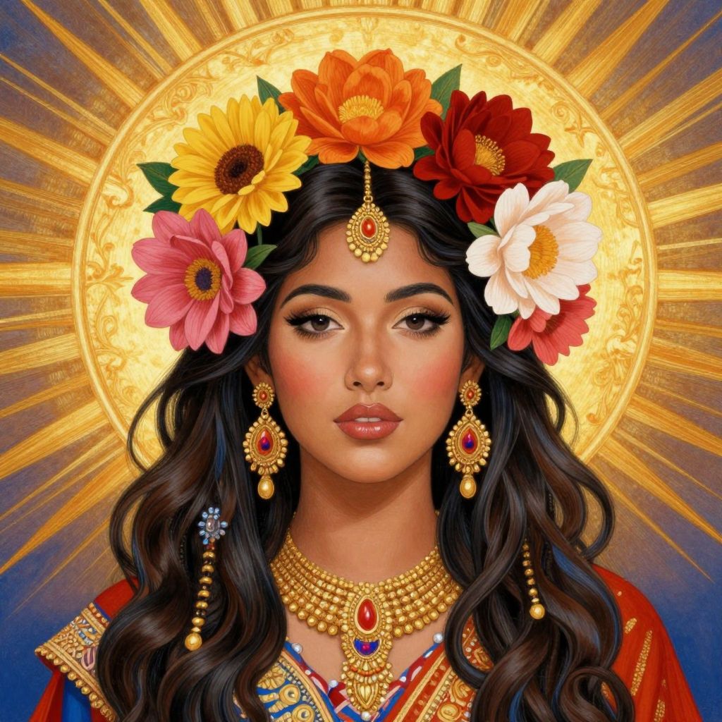 Digital art of a beautiful woman with dark, wavy hair, adorned in gold jewelry, wearing a colorful flower crown, against a radiant gold halo.