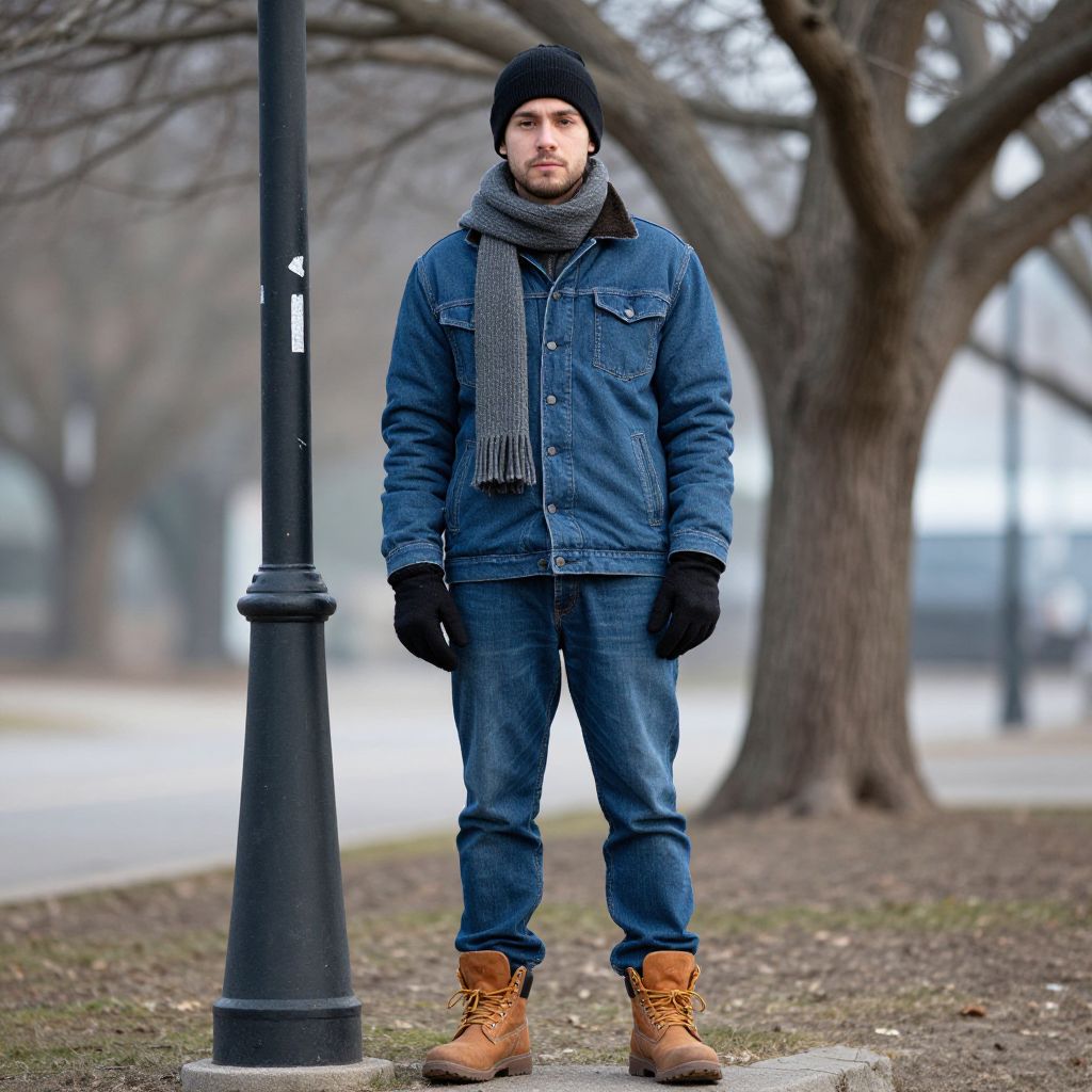Photograph of a bearded man standing outdoors in a park during winter. He wears a black beanie, gray scarf, blue denim jacket, matching blue jeans, black gloves, and tan lace-up boots. He stands in front of a black streetlamp, with leafless trees and a blurred, snowy background. The ground is covered in sparse grass and dirt. The man's expression is neutral, and the overall scene is overcast, contributing to the chilly atmosphere.