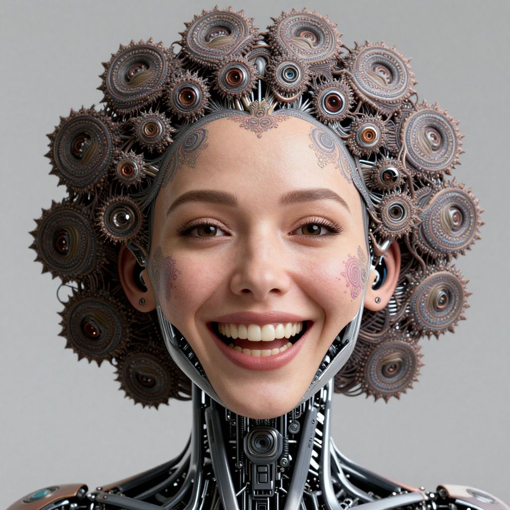 85 mm, beautiful frontal face portrait of a woman, euphoric expression, inspirational, 150 mm, mechanical skin, paisleys, mandelbrot fractal hair, robot eyes, symmetric, intricate, highly detailed,