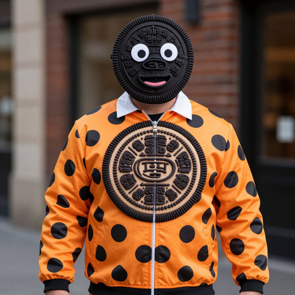 Photograph of a person wearing a bright orange jacket with large black polka dots, and a black Oreo cookie mask with white eyes and a smiling mouth. The jacket features a large circular Oreo cookie design on the chest. The person is standing outdoors in front of a brick building with a dark window. The jacket has a white collar and a visible zipper. The overall costume is playful and whimsical, blending food branding with streetwear fashion.