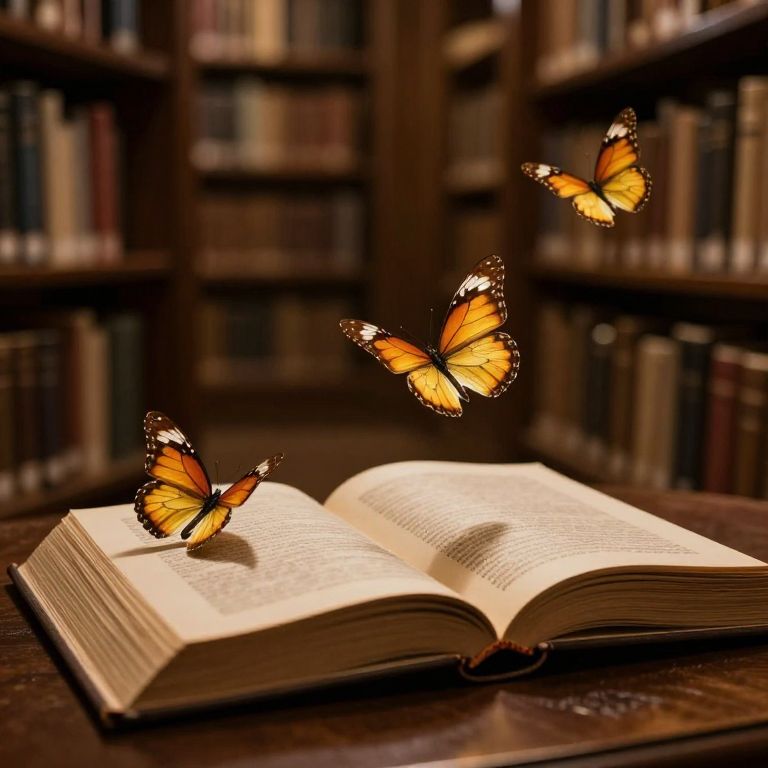 In a hushed library bathed in golden light, delicate butterflies emerge from the pages of an open book, their wings shimmering like living embers, as if stories take flight and weave through the timeless aisles of knowledge.