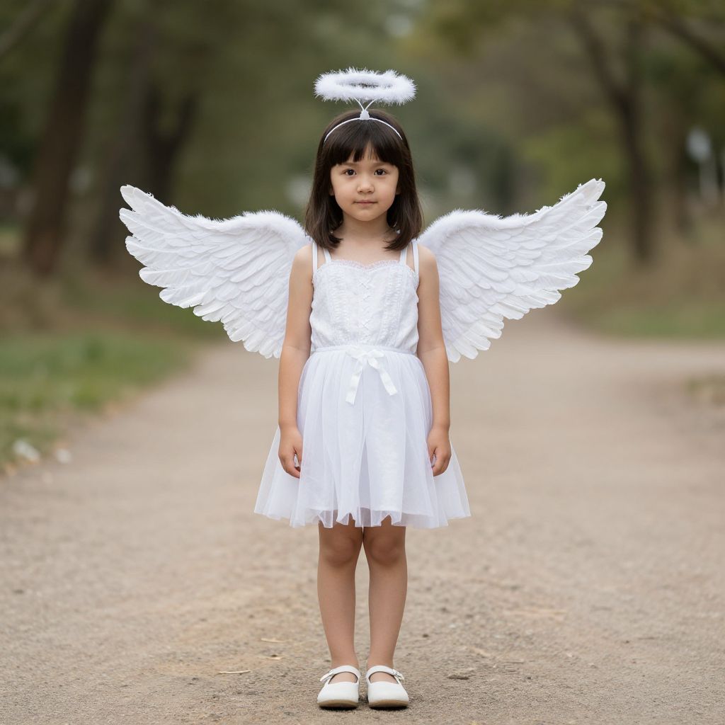 Photograph of a young Asian girl with straight black hair, wearing a white angel costume with wings, halo, and white shoes, standing on a gravel