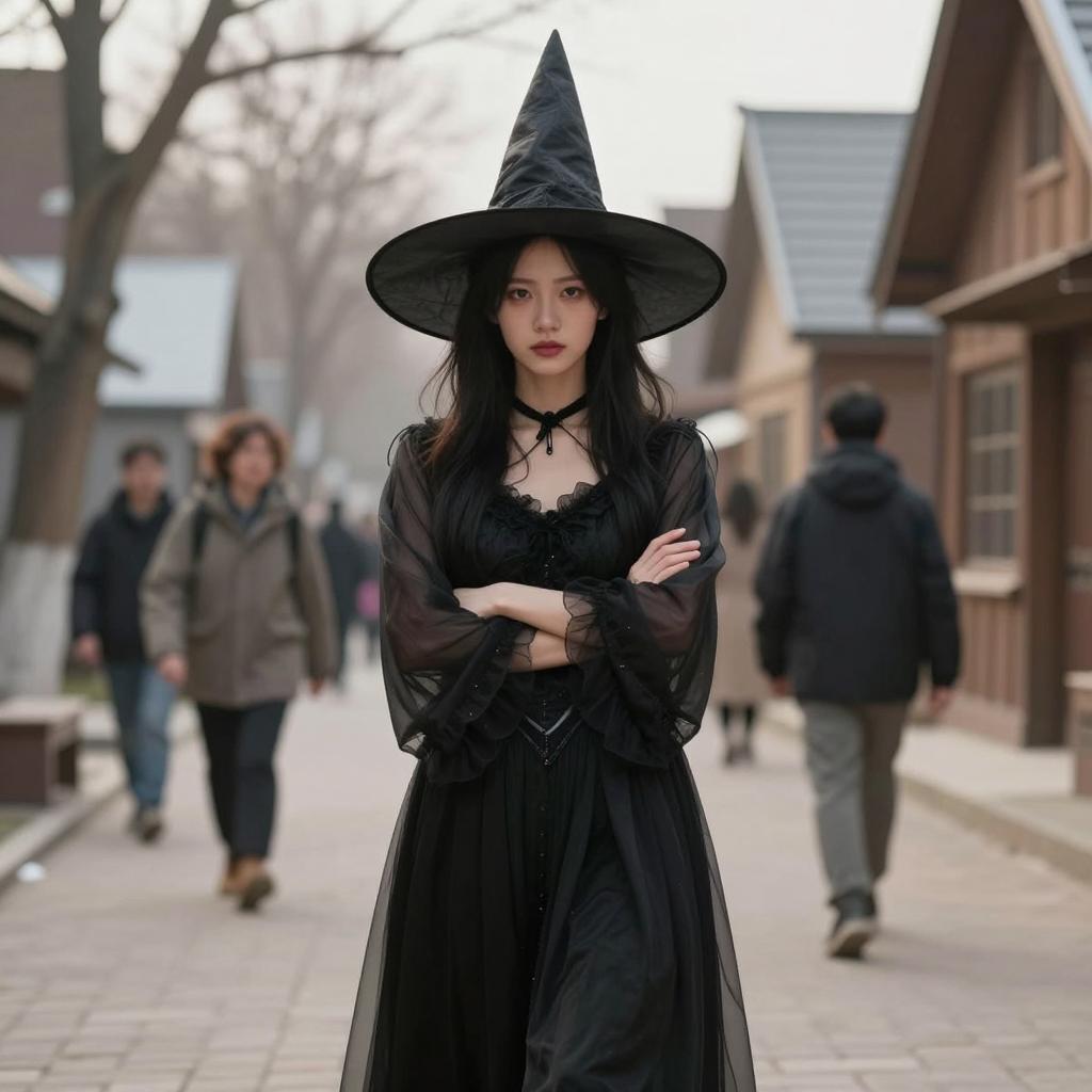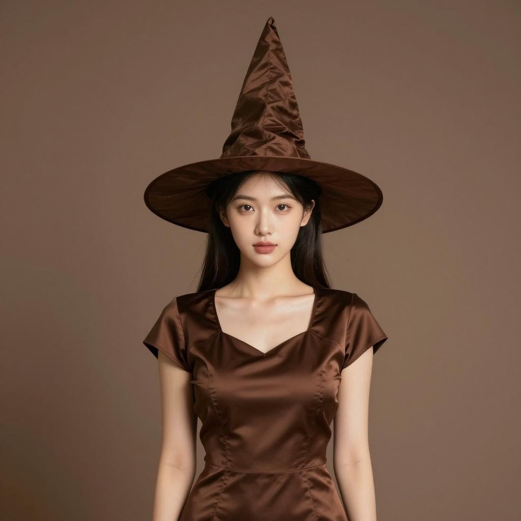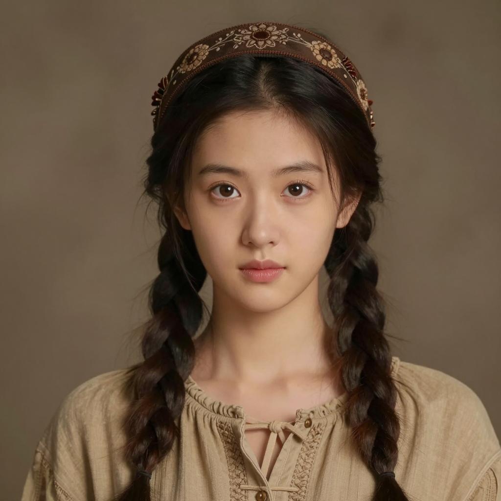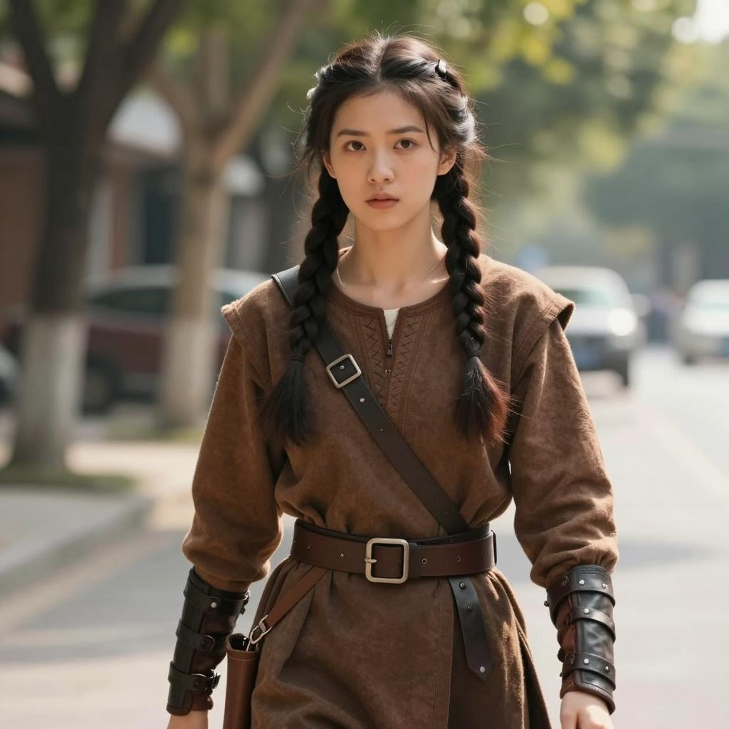 Green cape costume, photorealistic portrait of a young woman with fair skin, green hooded cloak with brown fringes, soft lighting, forest background, slightly blurred green leaves in the background, calm expression, subtle makeup, natural light, realistic ures, slightly warm color palette, upper body focus, serene and gentle atmosphere, realistic fashion style, photographic realism, detailed ures on cloak fabric