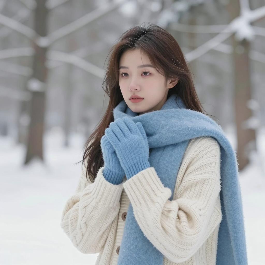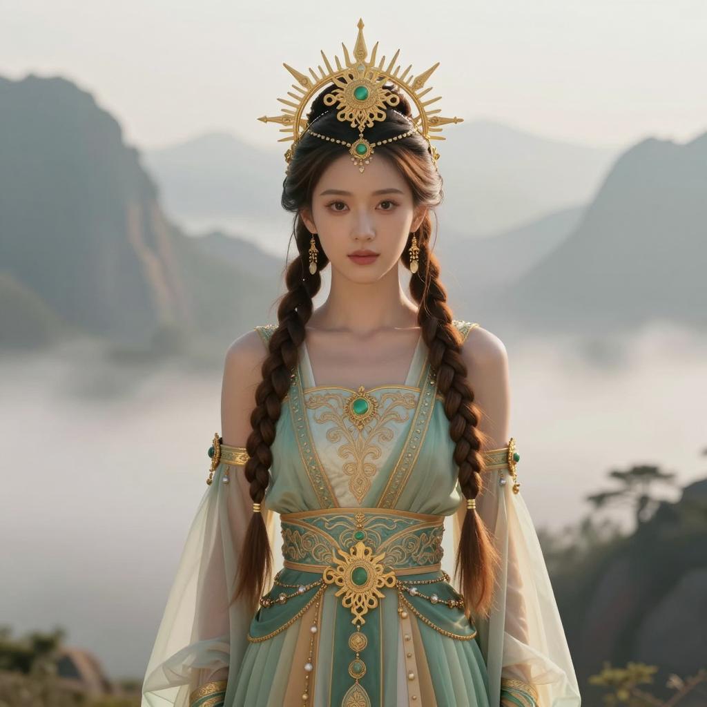 Photorealistic portrait of a young woman with fair skin wearing a green hooded cloak with brown fringes, standing in a forest setting. The image features soft, natural lighting with a slightly warm color palette, blurred green leaves in the background, and the upper body of the subject in focus. The woman has subtle makeup and a calm, serene expression, emphasizing a gentle atmosphere and realistic fashion style.