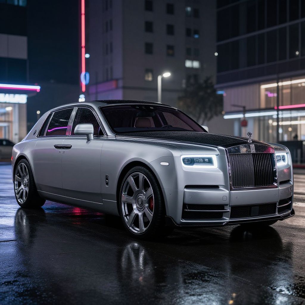 2023 Mansory Rolls-Royce Phantom, high-performance modified luxury limousine, elegant matte silver finish, large polished rims with low-profile tires, set against an urban nighttime background with neon reflections and rain-soaked streets