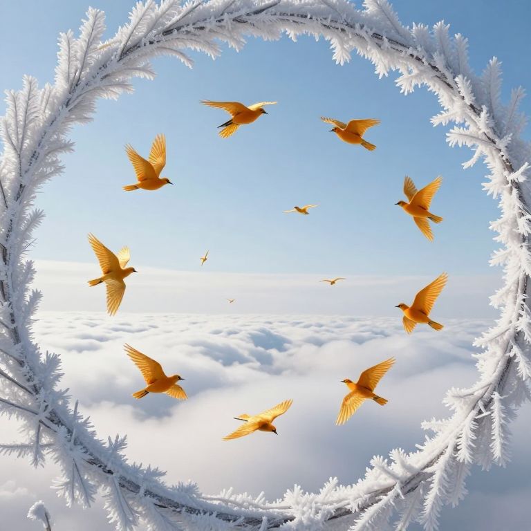 Circular arches of frosty, feathered branches frame a serene sky where twelve birds with golden-orange wings gracefully loop and soar in Möbius-like patterns above a sea of fluffy clouds.
