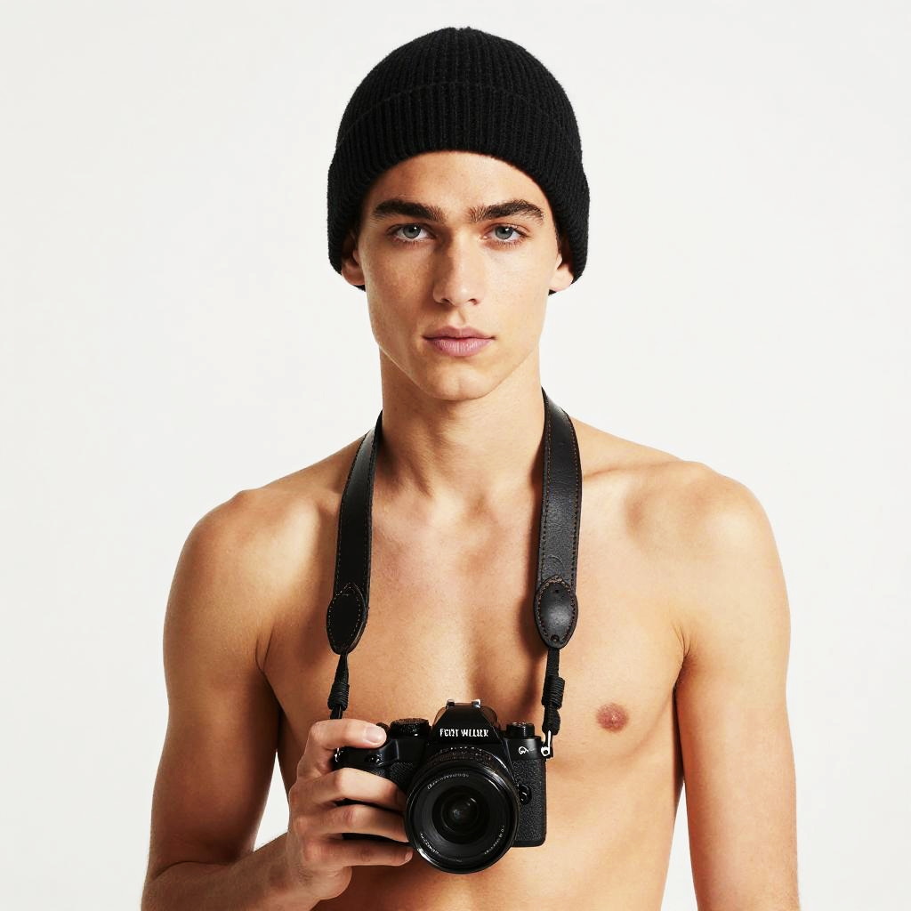 A professional photographic portrait of an attractive young male photographer, wearing a leather camera strap and knit beanie, with perfect eyes and slim body, white background, photographed by Tim Walker, 4K