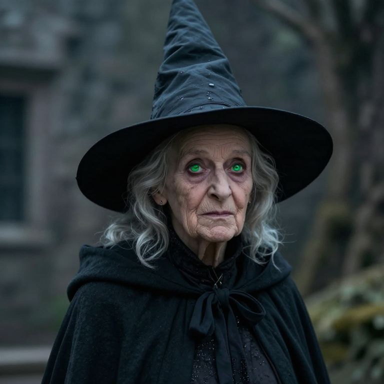 An elderly witch with green eyes and a pointed hat, wearing a dark cloak.