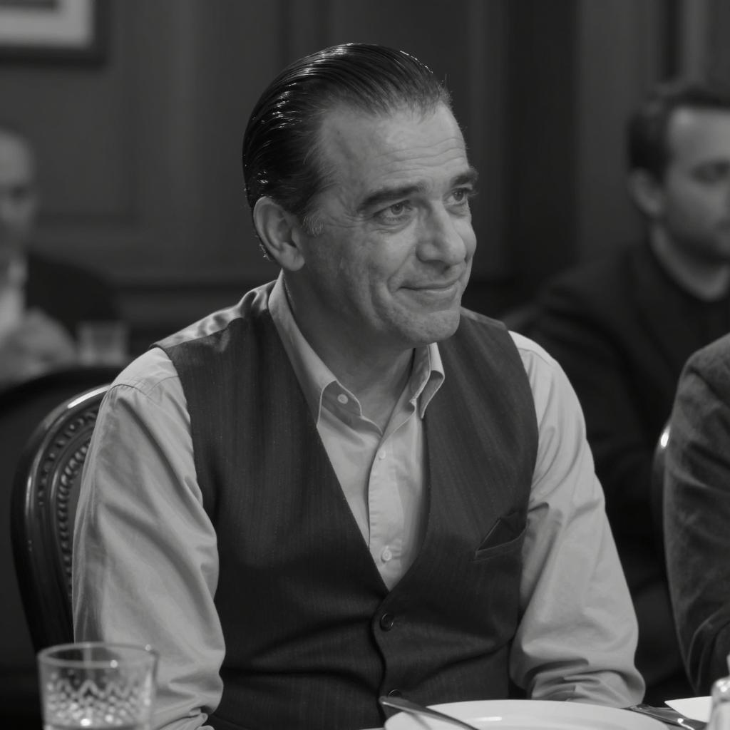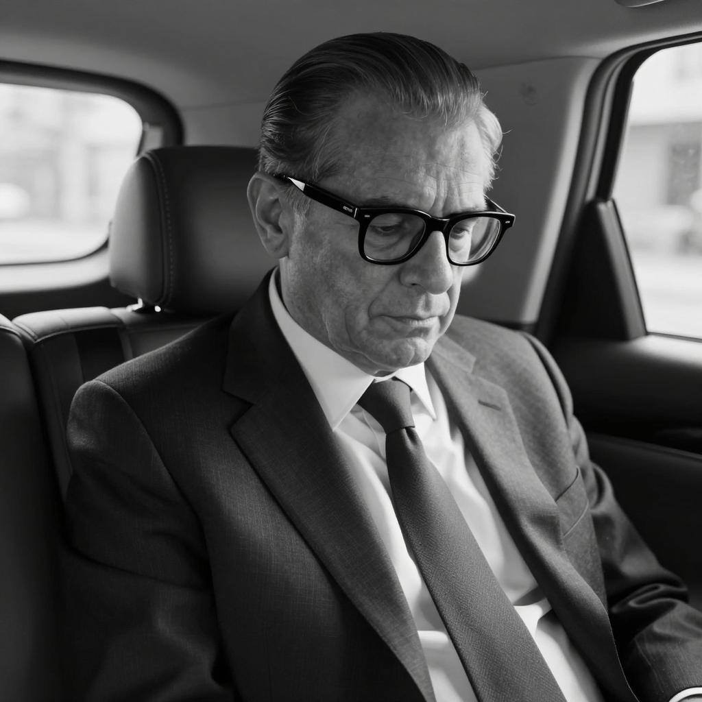Black-and-white photograph of a middle-aged man with slicked-back hair, wearing a thick coat over a collared shirt. He sits in the backseat of a car with vertical neon lights on the left. Leather seats are visible behind him. His expression is neutral, looking slightly to the right. The car interior is dimly lit.