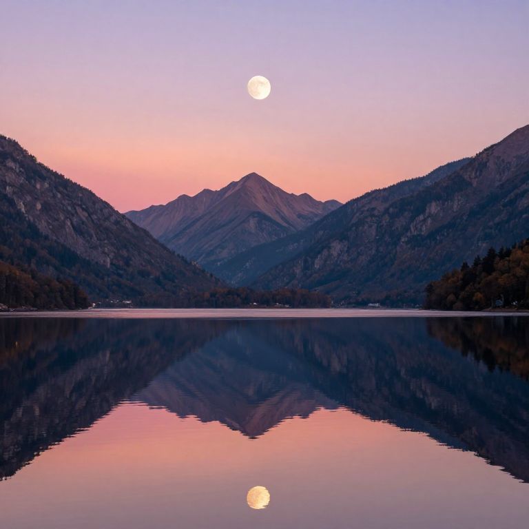 Glazy icy mountain lake at sunset, smooth glassy water reflecting pastel colored sky with snowy peaks, serene and pristine natural landscape, detailed foreground with frosted rocks and frost-covered plants, tranquil and crisp atmosphere.