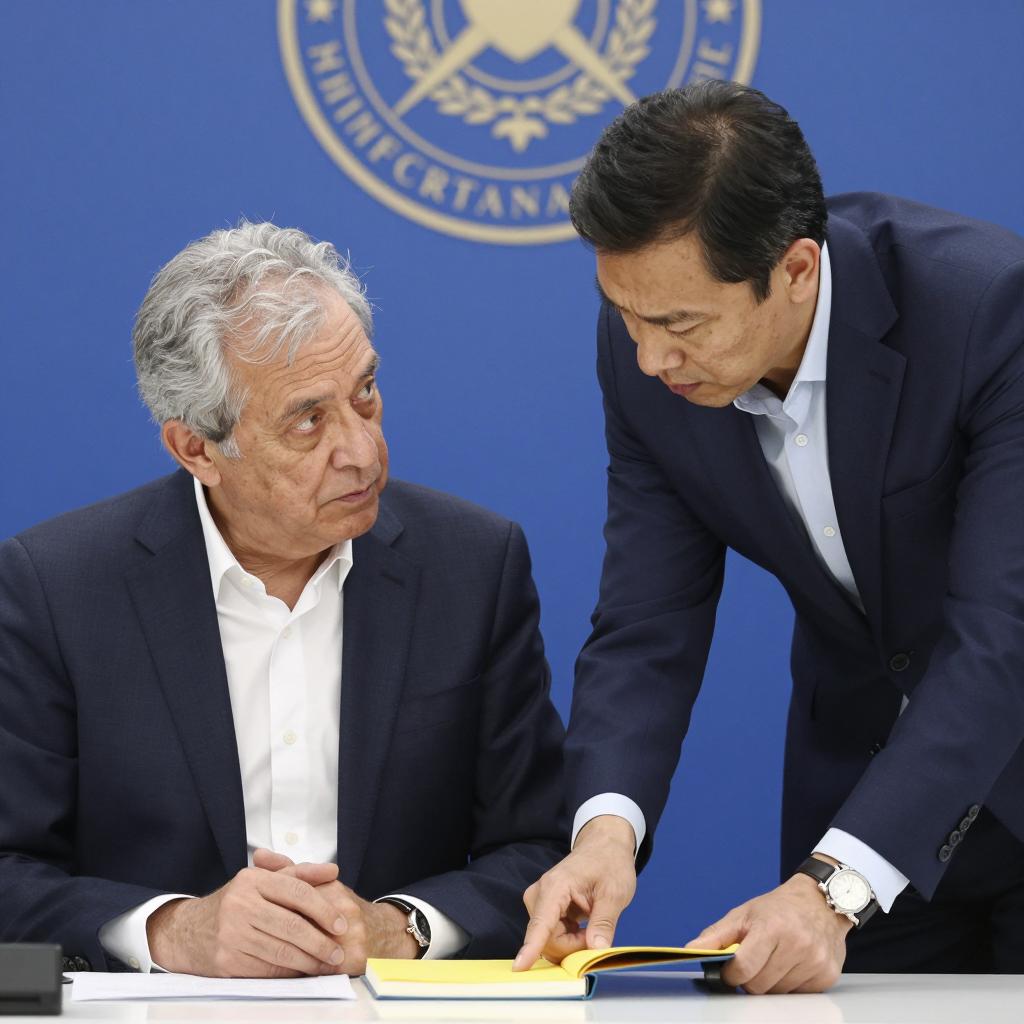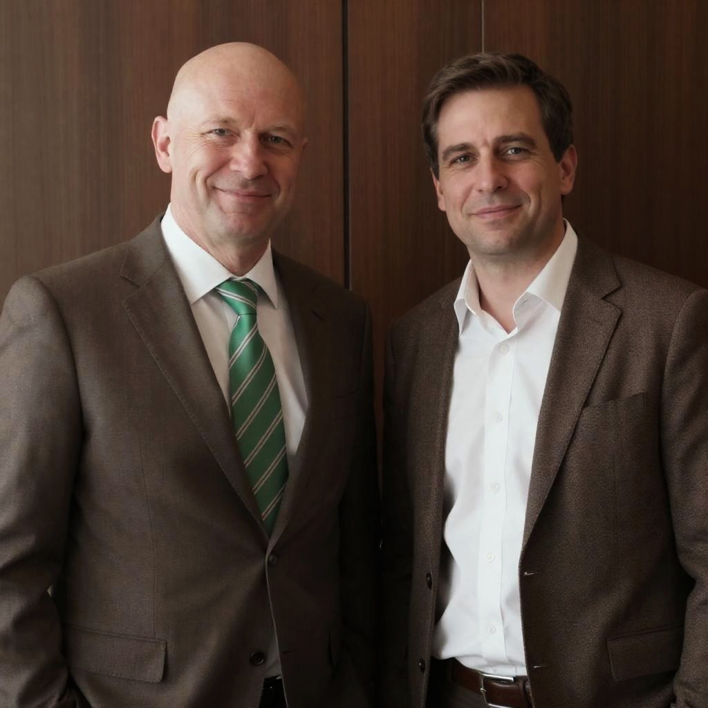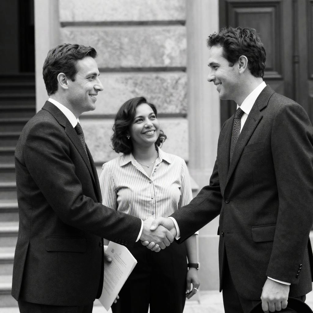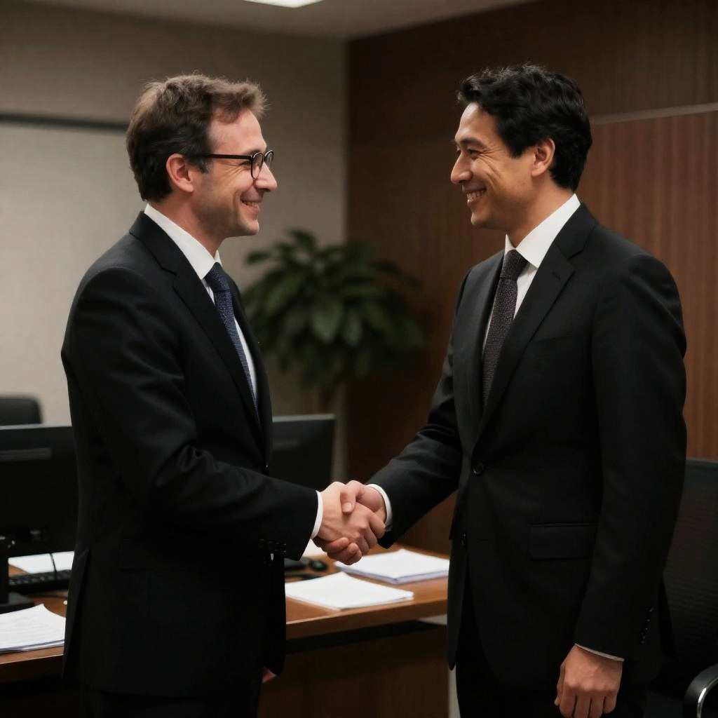 Two men shaking hands in an office, dimly lit. Left man with brown hair, glasses, black suit. Right man with dark hair, white shirt, patterned tie, black suit. Both smiling. Background with plant, papers, and wooden walls.