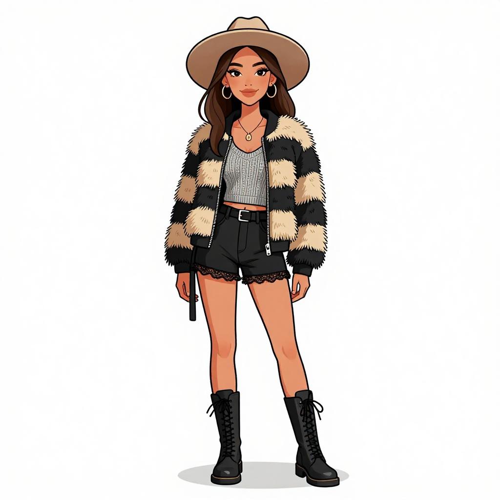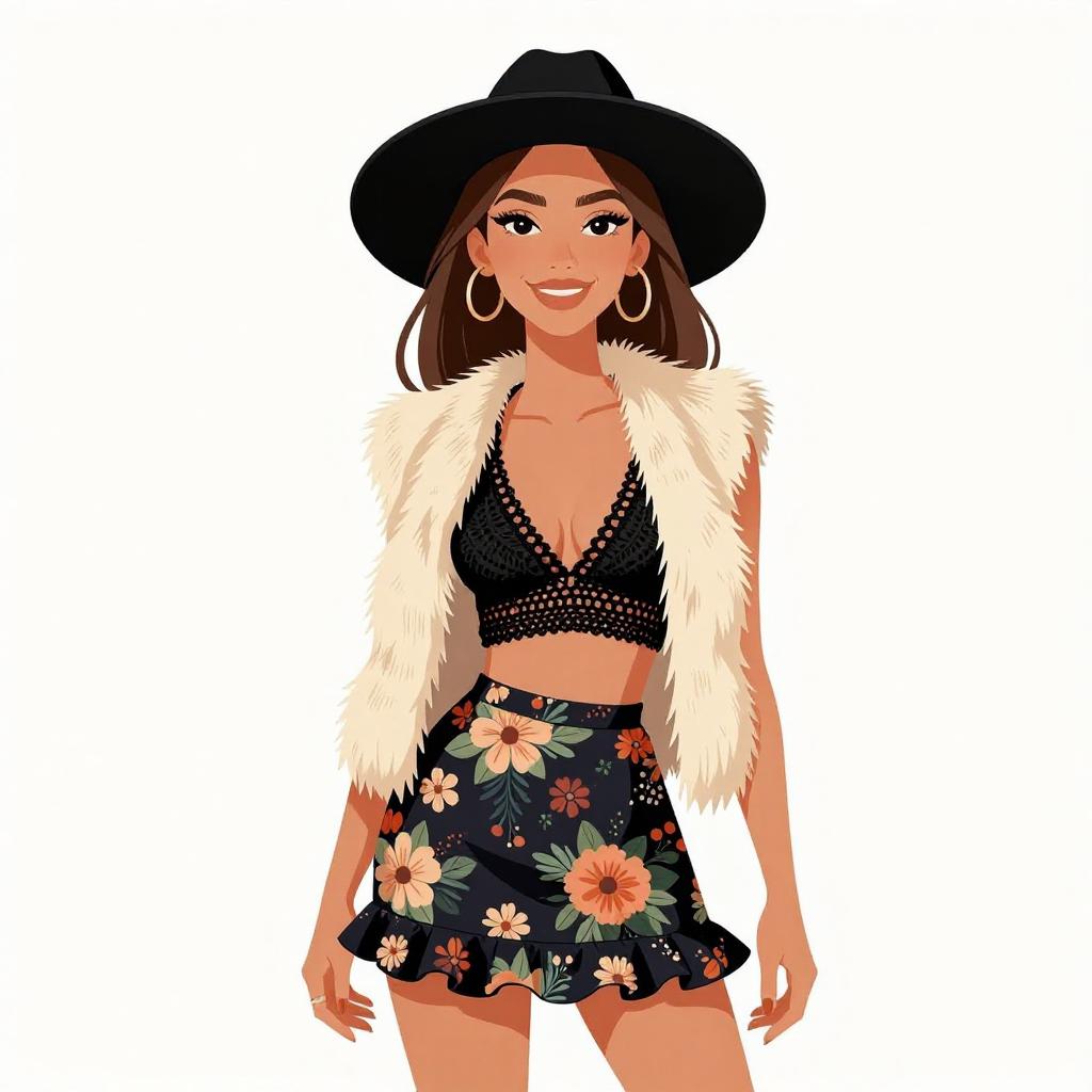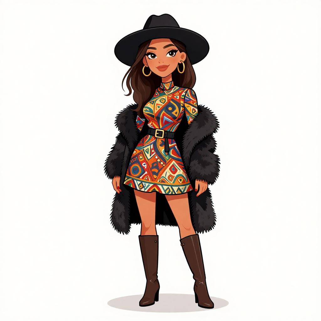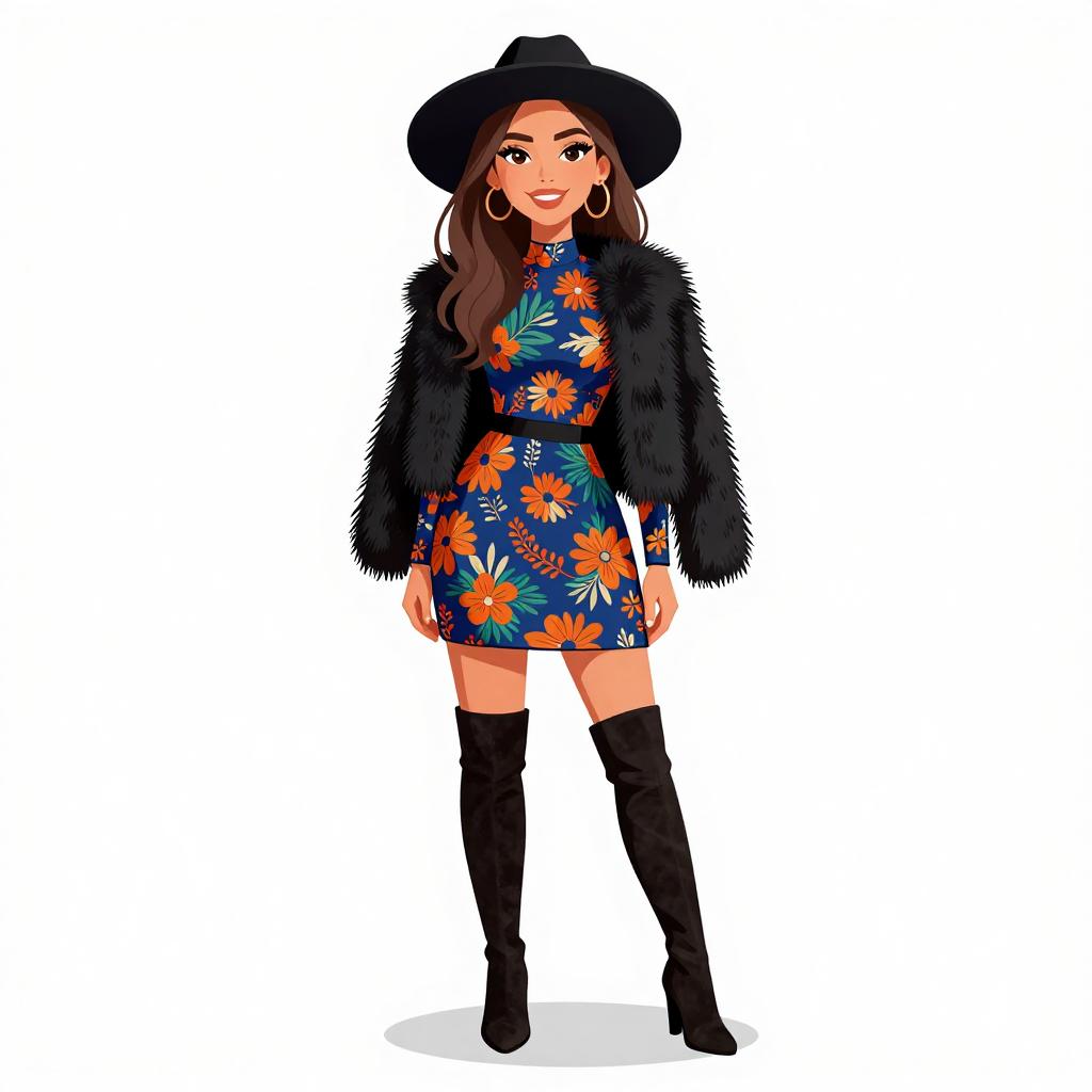 Woman with pretty face and pretty hair. smiling Woman, boho-chic, floral print mini dress in earth tones, long bell sleeves, V-neckline, black opaque tights, faux fur open-front coat with horizontal stripes, chunky black leather ankle boots, layered gold necklaces, black brimmed hat, oversized black shoulder bag, photo studio background --sref 1467