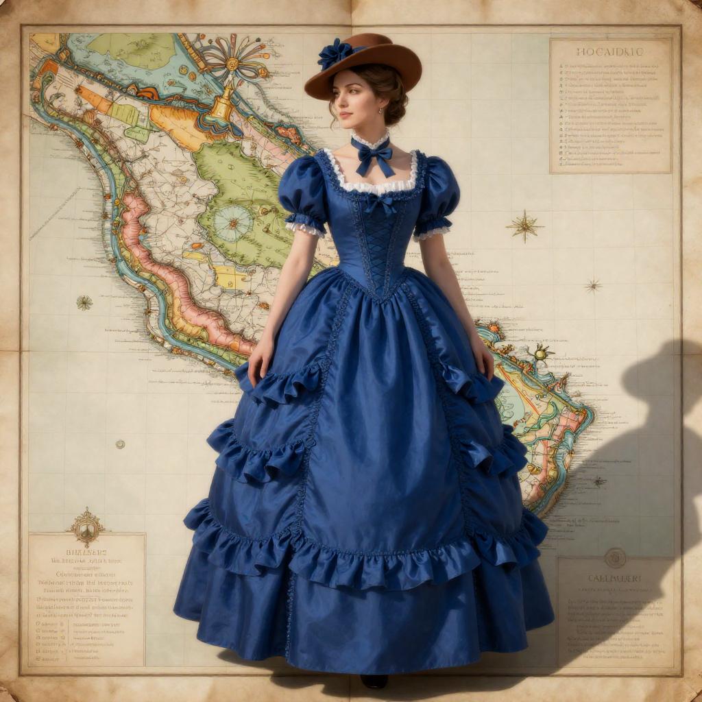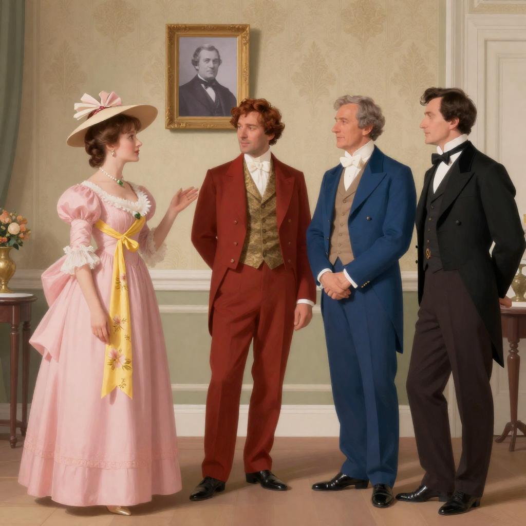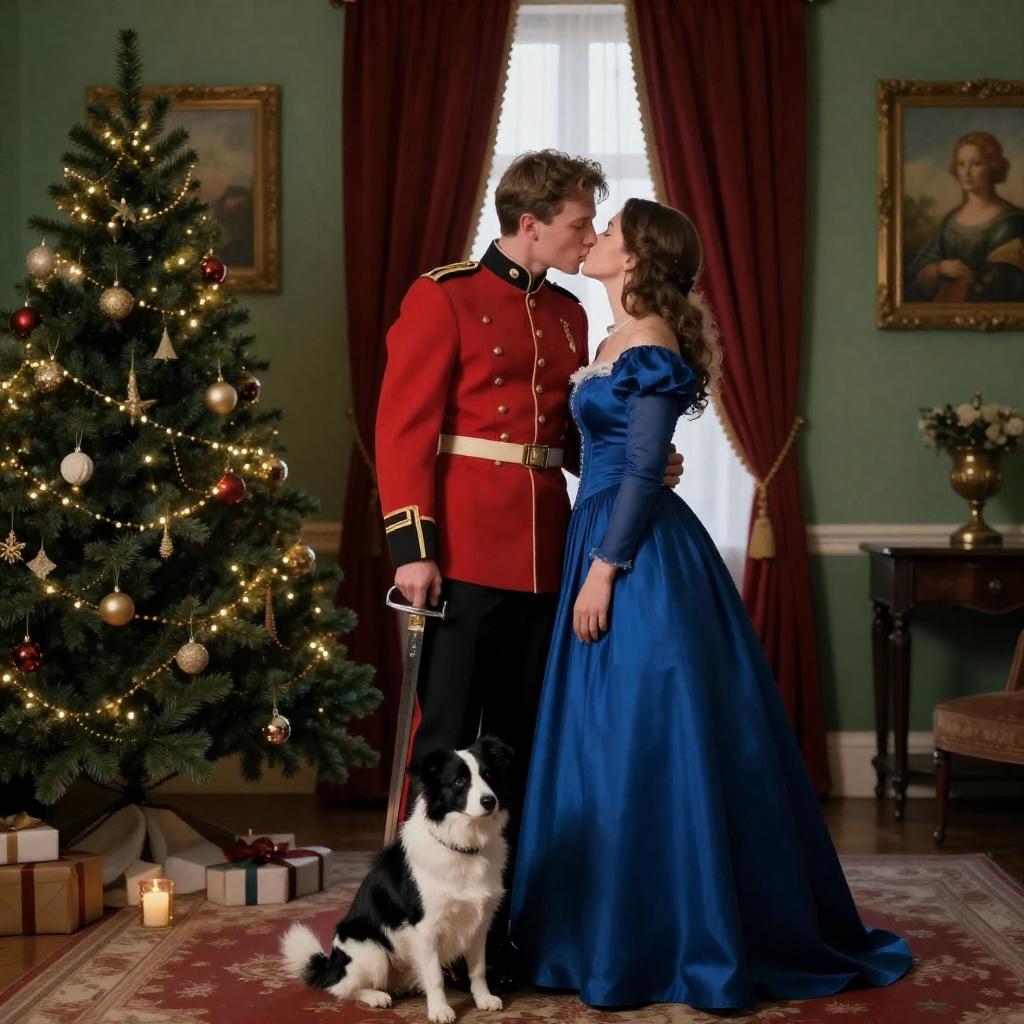 A digital painting of a misty forest with tall trees. A woman in a blue Victorian dress and bonnet stands facing a man in a red military uniform and black hat, holding hands. The man holds a sword at his side. The woman gazes up at the man, who looks down at her. The ground is covered in green moss.