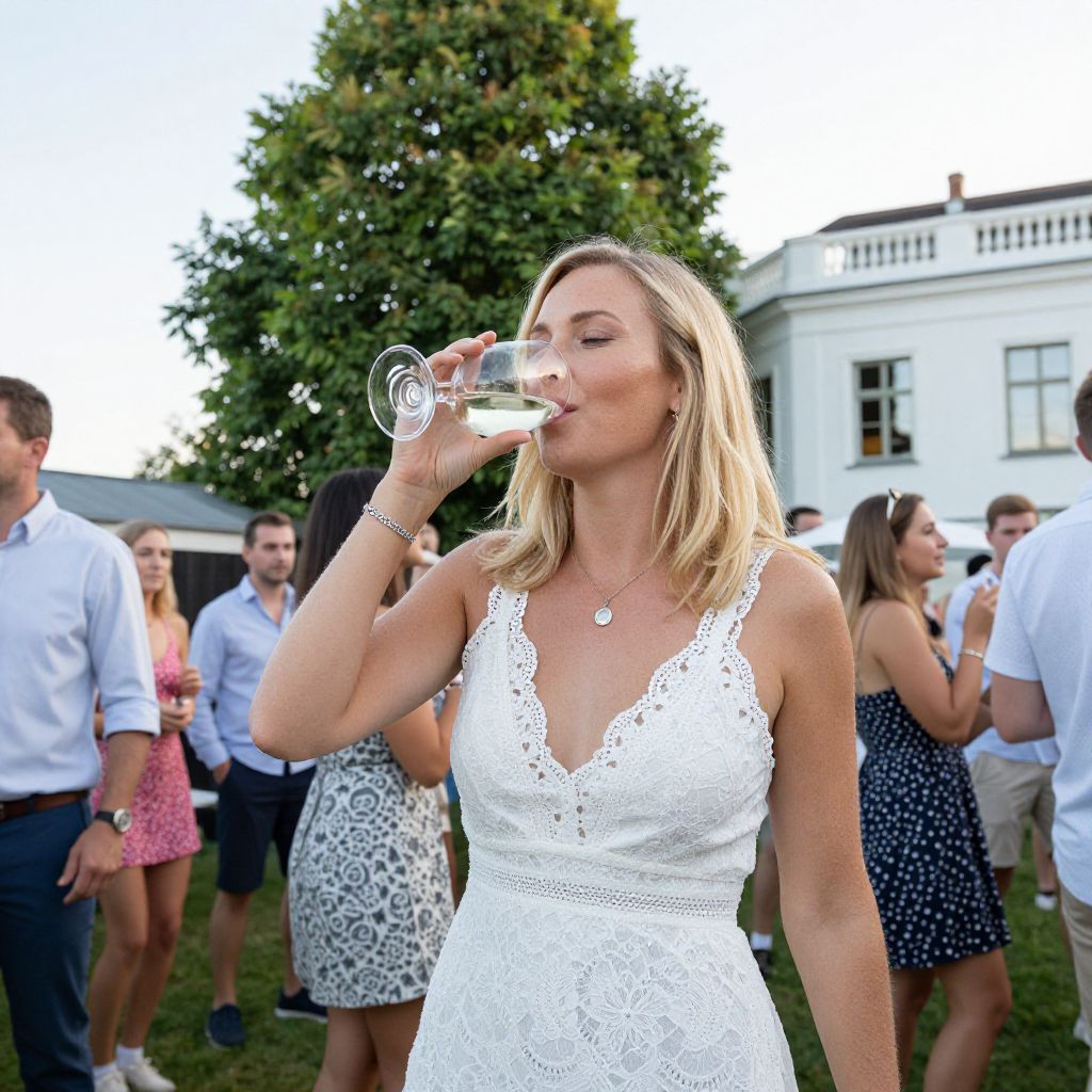 Photograph of a blonde woman in a white lace dress, drinking from a glass, standing outdoors at a social gathering with other dressed guests and a white