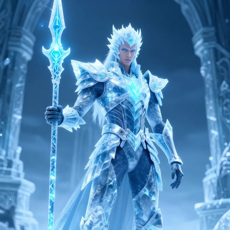 Ice anime character, a stoic guardian wearing a crystalline ice armor suit, holding a giant ice spear with luminous blue runes, frozen temple ruins in the background, cold color palette with heavy emphasis on icy textures, cinematic anime rendering