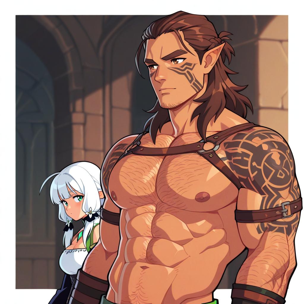 Digital illustration of a muscular dark-skinned elf warrior with brown medium-length braided hair, thick eyebrows, facial and arm tattoos, sparse chest hair, and large pectorals. The character stands confidently in a dimly lit medieval castle interior with stone arches and candles. He wears leather gauntlets and a belt with a circular emblem. An anime-style chibi character can be seen in the background.