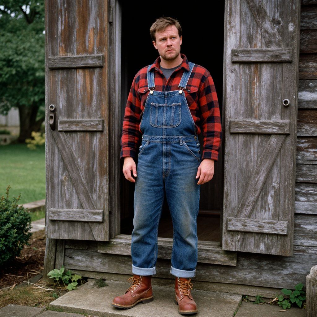 Photograph of a Caucasian man with short brown hair and a beard, standing in front of a weathered wooden barn door. He wears blue denim overalls over a red and black flannel shirt, with brown lace-up boots. His expression is neutral, and he stands with his hands by his sides. The barn door, slightly open, shows dark interior. The background includes a green lawn and trees. The man's attire and setting suggest a rustic, countryside theme. The image has a rich, natural color palette with textures of worn wood and denim fabric.