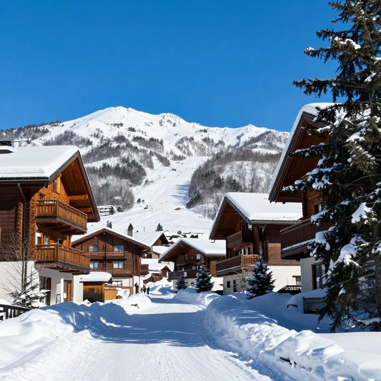 Photograph of a snowy mountain village with illuminated wooden chalets, people ice skating, surrounded by snow-covered pine trees and mountains.