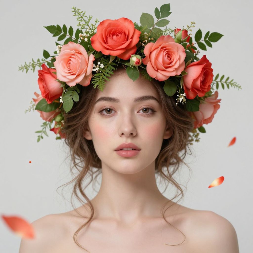 Ethereal blossoms cascade from a woman's head, forming a vibrant crown of coral and crimson roses intertwined with verdant foliage, as delicate petals float gracefully around her serene visage.