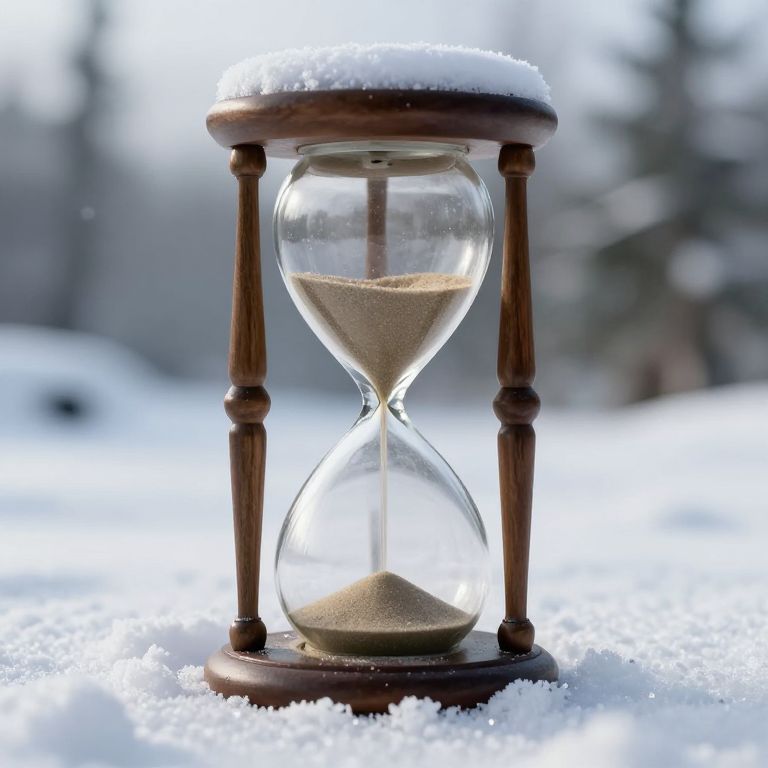 Photograph of a traditional wooden hourglass standing in a snowy landscape. The hourglass has a dark brown wooden frame with four slender legs and a matching top and bottom plate, each dusted with snow. Inside, fine sand is visibly trickling from the upper glass bulb to the lower one, creating a sense of time passing. The background is softly blurred, featuring a snowy forest with indistinct, leafless trees. The snow on the ground is bright white, contrasting with the dark wood of the hourglass and the clear, golden sand. The image is well-lit with natural light, highlighting the textures of the snow and wood.