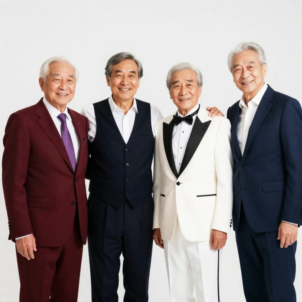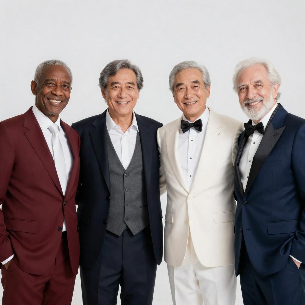 Portrait of four senior men standing closely, dressed in formal suits. The man on the left has dark skin, gray hair, and wears a red suit with a white shirt and tie. The second and third men have East Asian features and are dressed in dark blue suit with gray vest and white tuxedo with black bow tie, respectively. The man on the right has light skin, gray hair and beard, wearing a blue suit with a black patterned scarf. They are smiling and posing against a plain white background.
