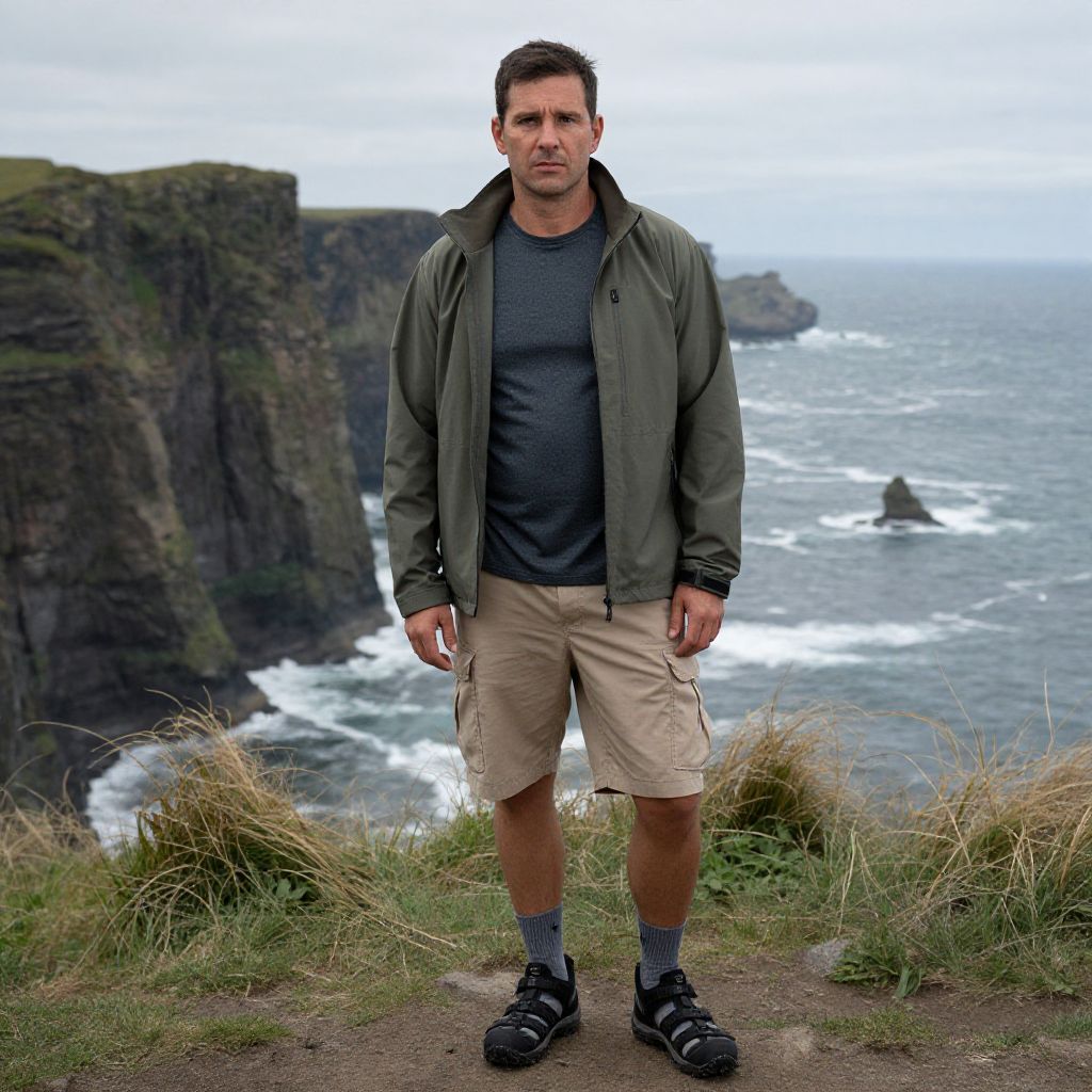 Photograph of a muscular, Caucasian man with short brown hair, standing on a grassy cliff overlooking a stormy ocean. He wears a dark green, unzipped jacket over a gray T-shirt, beige knee-length cargo shorts, blue socks, and black hiking shoes. The background features rugged, dark cliffs with green patches to the left and white-capped waves crashing into the rocky shore to the right. The sky is overcast, adding a moody atmosphere to the scene. The man's serious expression and direct gaze towards the camera add intensity to the image.