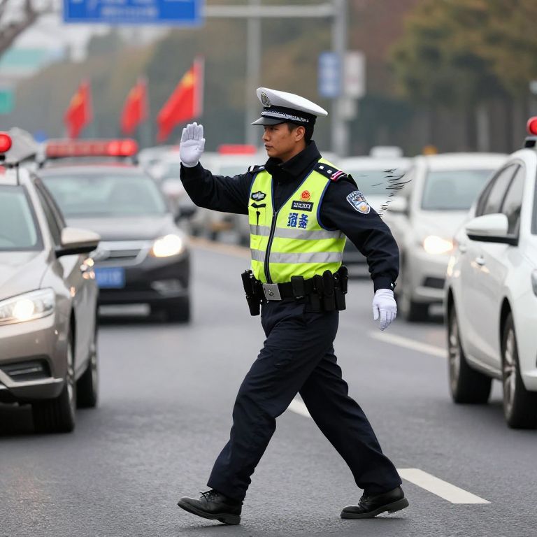 Photograph of an Asian male police officer in a neon yellow vest, white gloves, and cap, walking on a busy urban road with cars and red