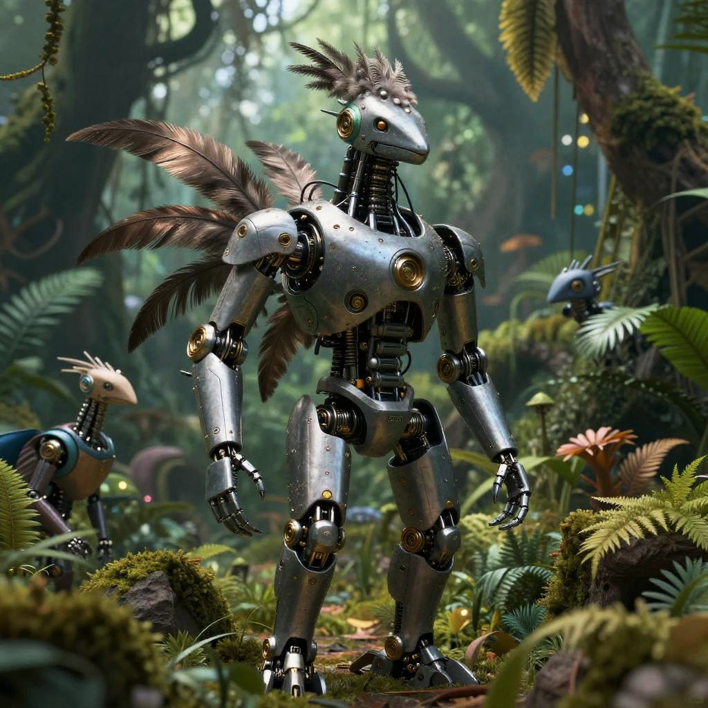 What are free AI image generators showing imaginative robotic creatures in vibrant natural environments, metallic textures mixed with organic elements like leaves and flowers, softly glowing particles, fantasy realism style, highly detailed and atmospheric.