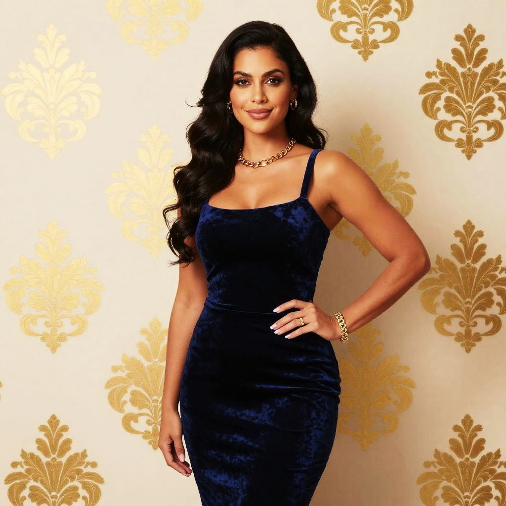 Photograph of a smiling woman with long, wavy dark hair standing on a yacht deck. She wears a pink, spaghetti-strap, tulle dress that flares out at the waist, showing some cleavage. She's accessorized with a sparkly necklace and is holding a strand of her hair. The background features a clear blue sky and the white yacht with railings. The ocean is visible behind her.