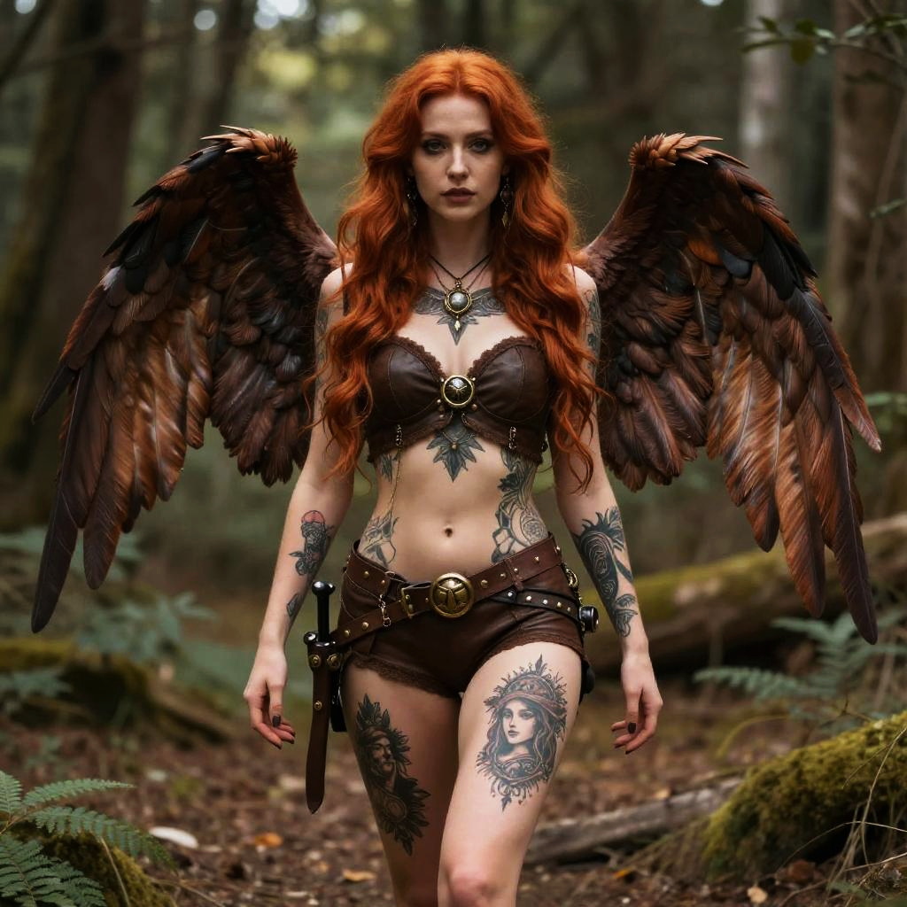 Photograph-like CGI of a red-haired, tattooed woman with black angel wings, wearing leather top and shorts, walking through a forest.
