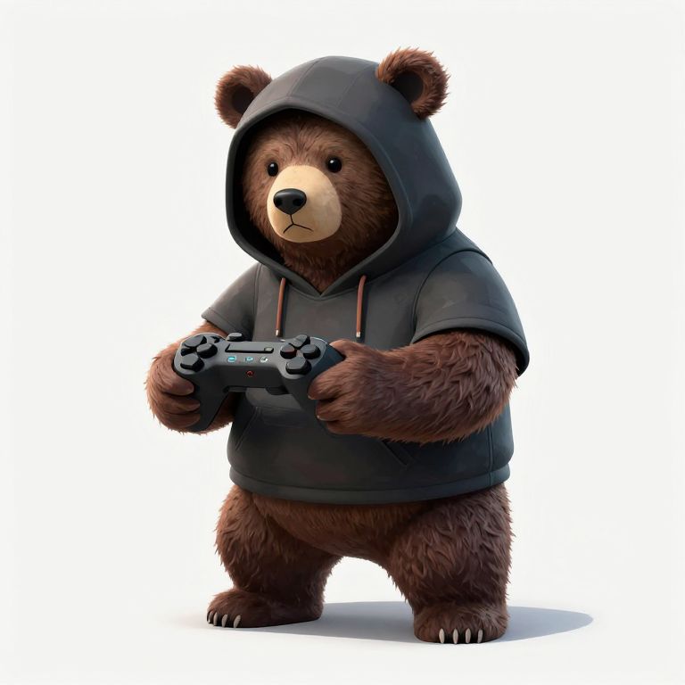 Digital illustration of a cute, brown bear wearing a black hoodie, holding a game controller, with a focused expression, against a white background.