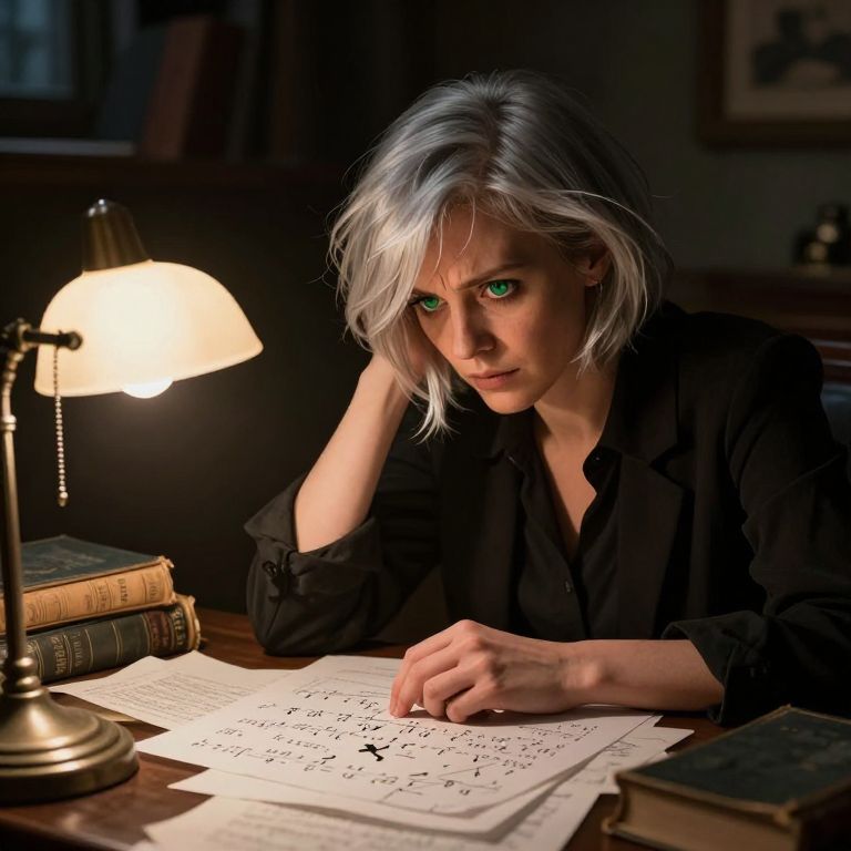 Create a photorealistic portrait of a renowned cryptographer immersed in her work. Capture her seated at an untidy desk amidst scattered papers and ancient tomes. Her intense green eyes are fixed on a complex equation, frustration subtly etched on her forehead as she grapples with a challenging puzzle. The scene is bathed in the warm glow of a vintage desk lamp, its shadows enhancing her determined expression. Her short silver hair frames her face, an errant lock falling across her brow, emphasizing the gravity of her task. Employ digital art techniques inspired by chiaroscuro and hyperrealism to craft a captivating portrait that encapsulates the tension between intellect and cryptography's mysteries, inviting viewers to delve into this enigmatic world.