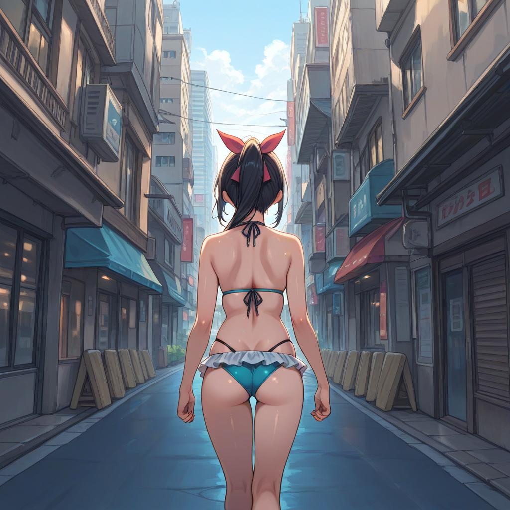 1girl, ponytail, hair ribbon, bikini, frills, gts, city, buildingseat, (ground view:1.2)