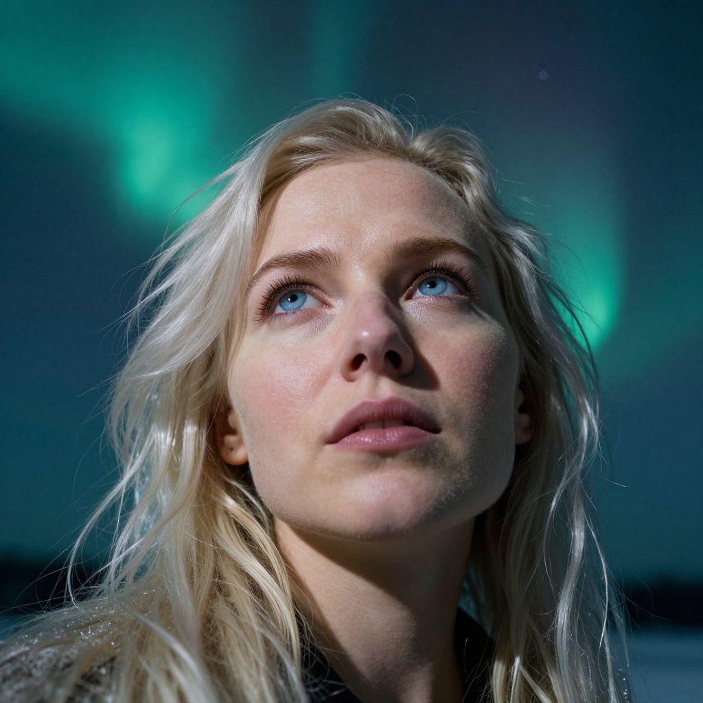 A portrait photograph showcases a European woman with captivating ice-blue eyes and flowing platinum blonde hair against an awe-inspiring backdrop of shimmering auroras. From a unique low angle perspective, her enigmatic expression is highlighted by the delicate interplay of light and shadow on her porcelain skin, emphasizing fine lines that suggest a life filled with joy. Her gaze, touched by the ethereal beauty of the northern lights, seems to transcend reality, inviting viewers into an emotional journey through wonder and introspection.